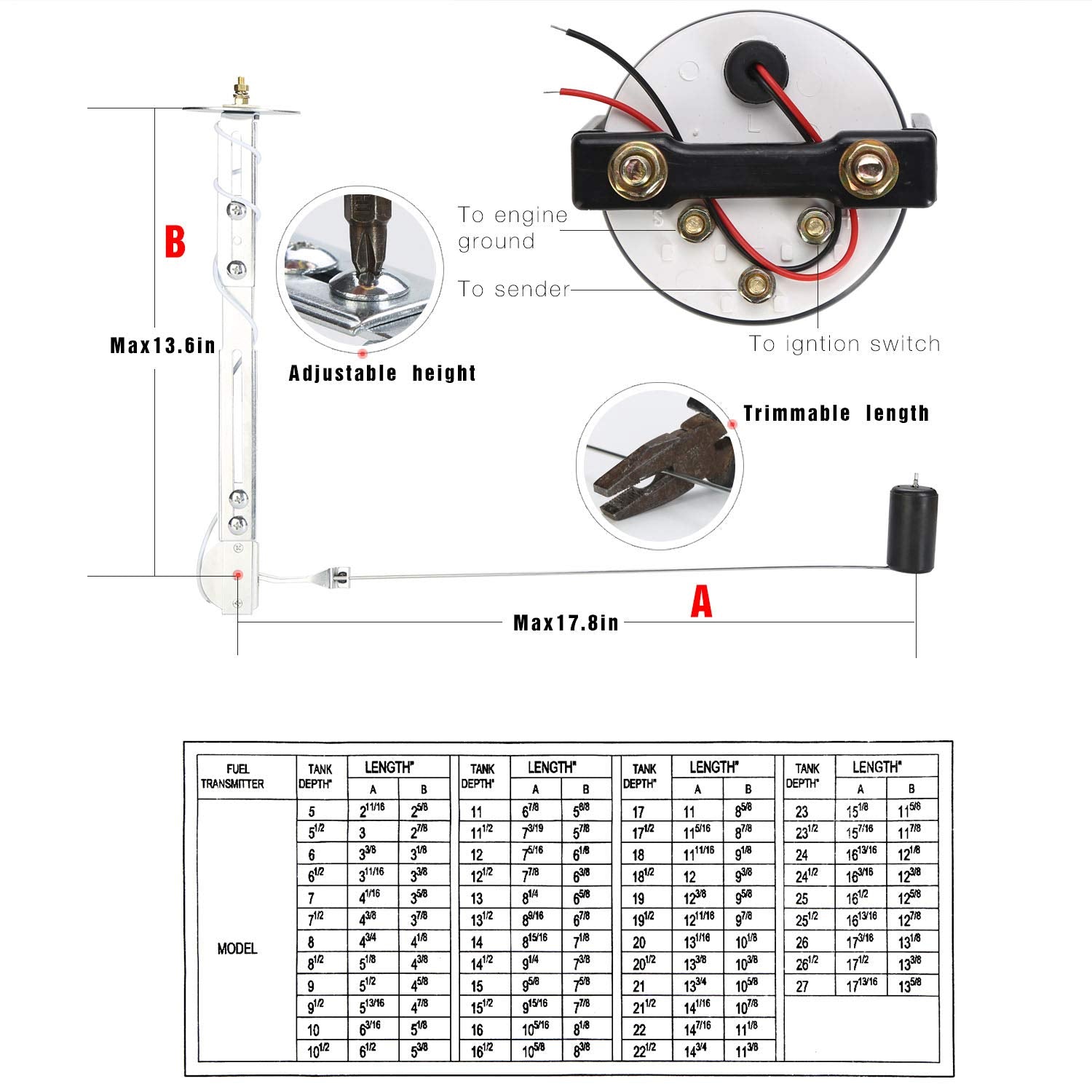 - [Multi-Size]: Diese Universal Auto Kraftstoffstandsanzeige haben verschiedene Grössen können ausgewählt werden, um verschiedene Grössen von Kraftstofftanks für Automobile, Schiffe, Yachten, Wohnmobil, landwirtschaftliche Fahrzeuge und