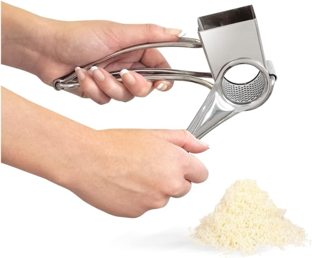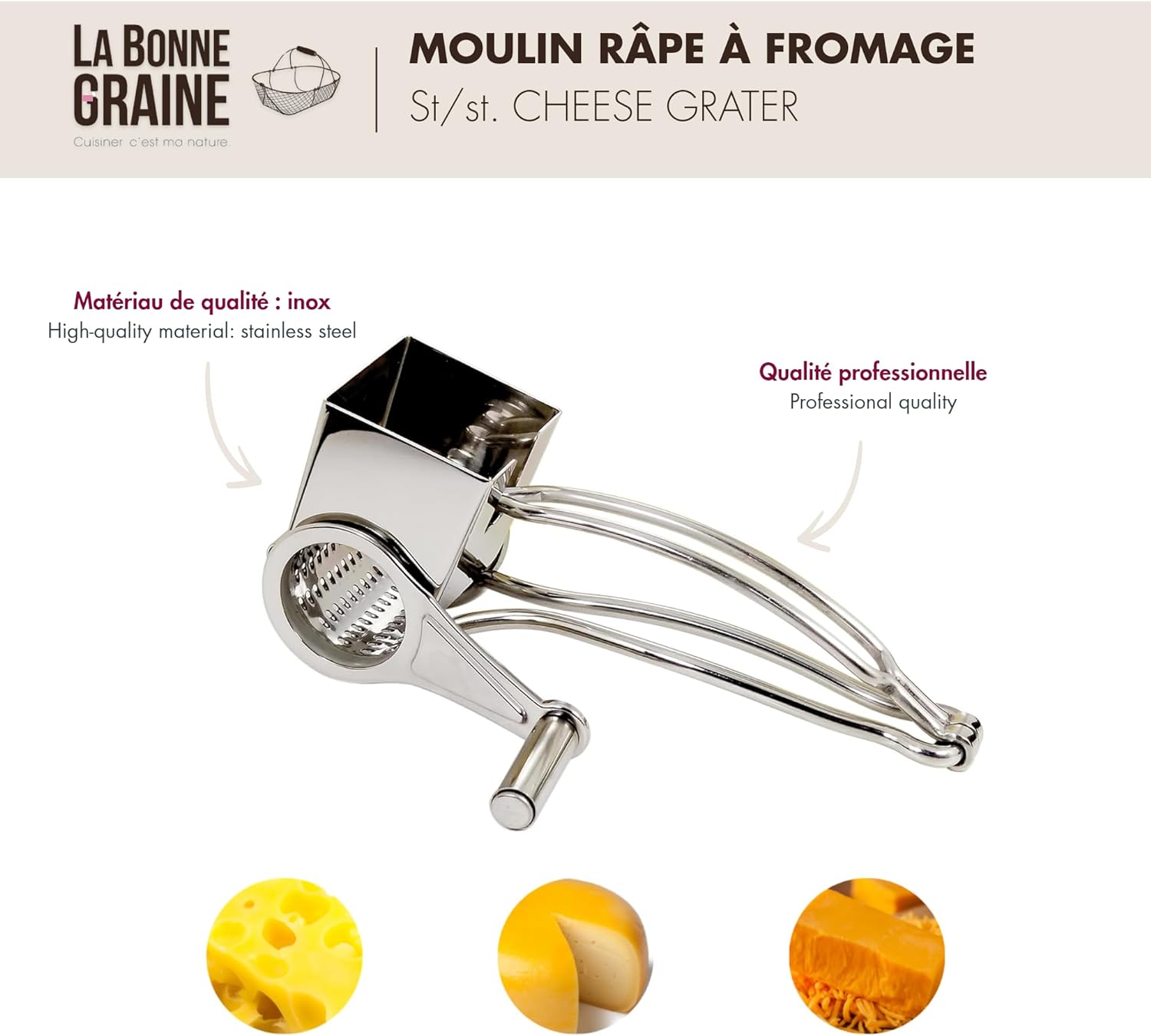 - Ein perfekter Käse in wenigen Handkurven: Die 1-Trommel-Reibemühle aus Edelstahl von La Bonne Graine ist ideal zum effizienten Reiben von Gruyère, Gouda, Mimolette, Cheddar, und anderen Hartkäse.