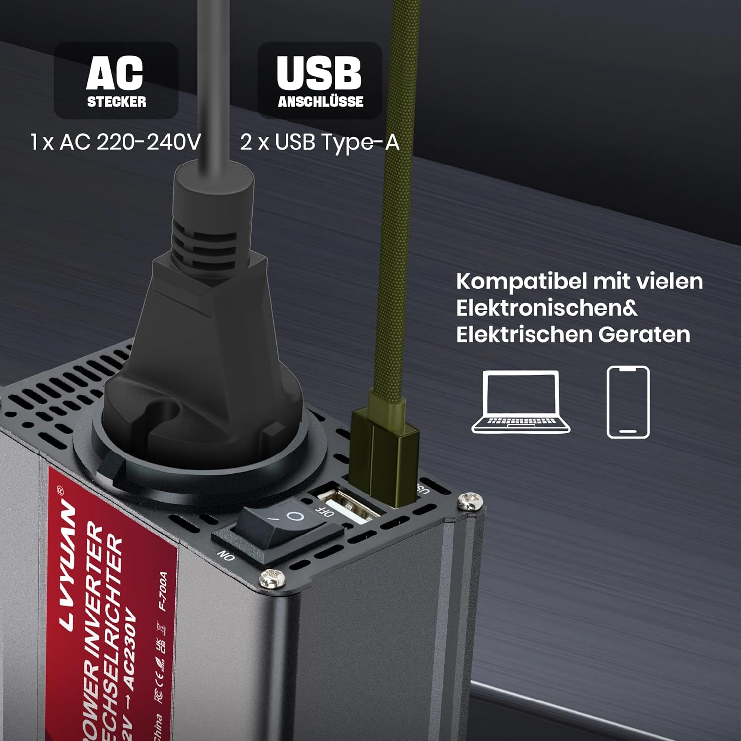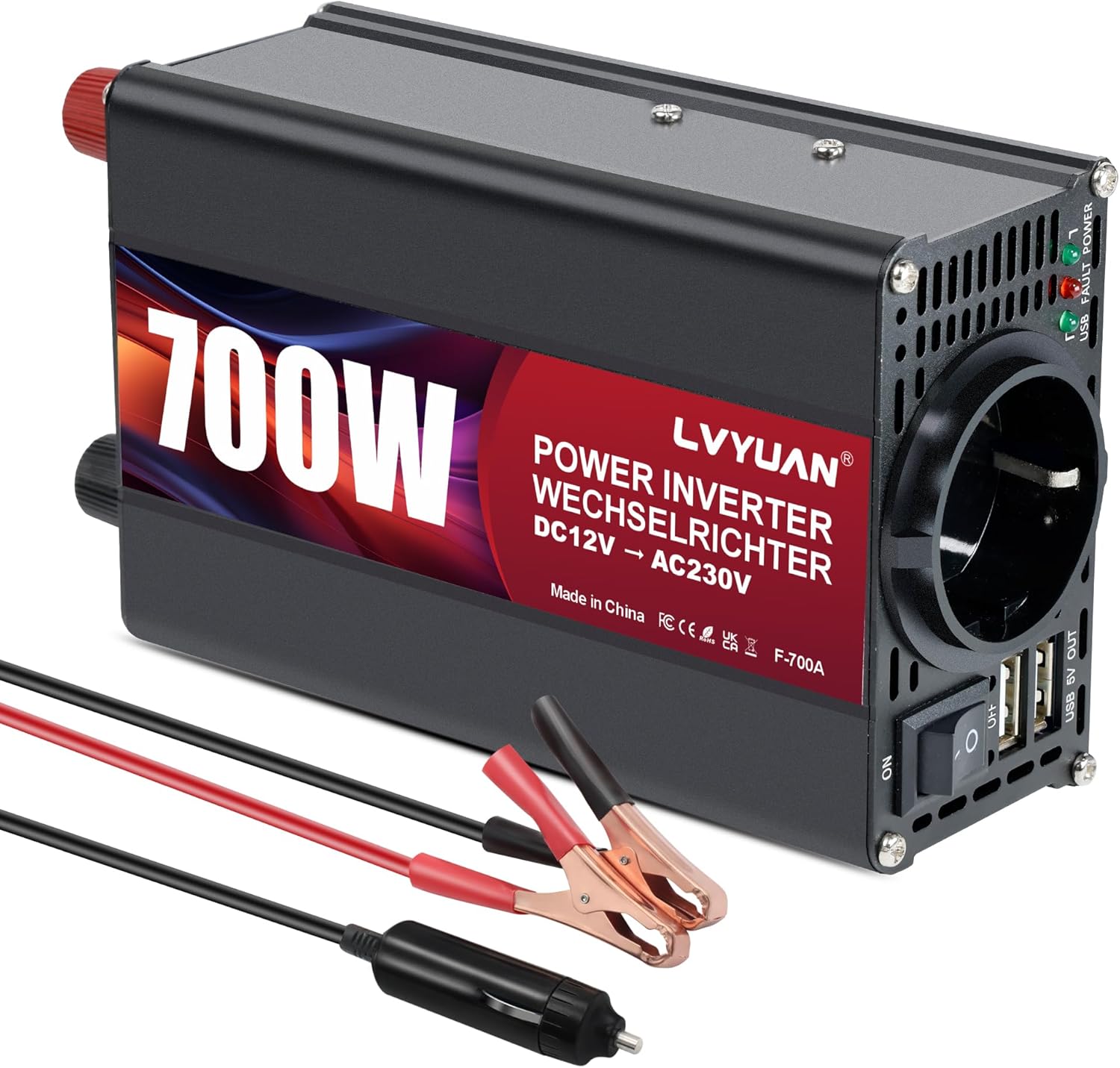 - Ausgangsleistung: 500 W, Spitzenleistung: 700 W (< 10 ms), modifizierter Sinuswellen-Wechselrichter 12 V auf 230 V