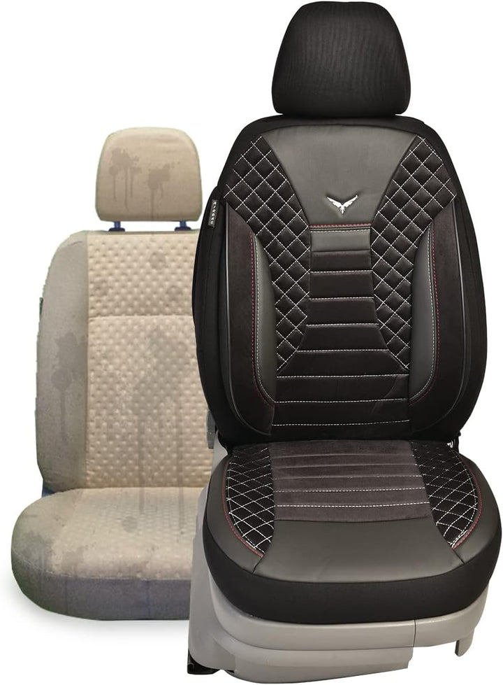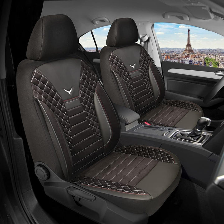 • LIEFERUMFANG - 1x Sitzfläche, 1x Rückenlehne für Fahrer, 1x Sitzfläche, 1x Rückenlehne für Beifahrer, 2x Kopfstützenbezüge, Klammer/Haken, Montageanleitung