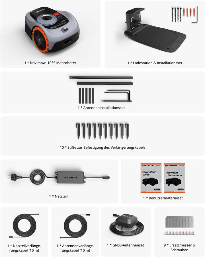 - Lieferumfang: 1 * Navimow i105E Mähroboter ohne Begrenzungsdraht, 1 * Netzteil, 1 * Netzteilverlängerungskabel (10 m), 1 * Antennenverlängerungskabel (10 m), 10 * Stifte zur Befestigung des Verlängerungskabels, 1 * Ladestation & Installationsset, 1 *