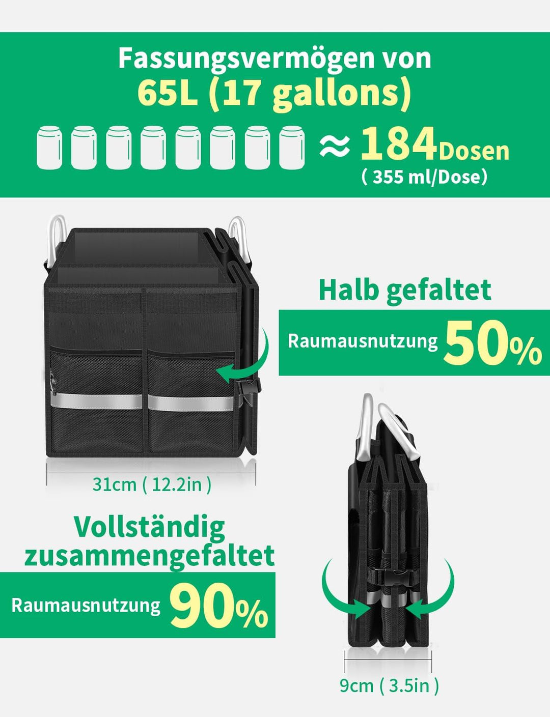 - Reflexstreifen: Die Neon-Reflektoren von Kofferraum Box bieten nachts zusätzliche Sichtbarkeit und Sicherheit beim Be- und Entladen Kofferraumtasche