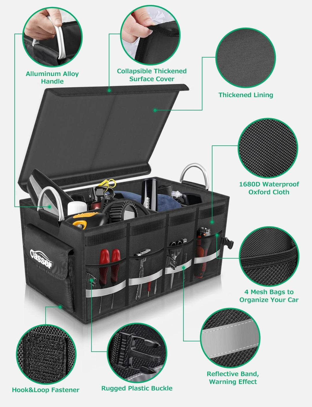 - Abnehmbare Deckel und Klettverschluss: Oasser Kofferraumtasche bietet eine vollständige Deckel, die Ihre Ladungen vor Staub oder Regenwasser schützen kann, Was noch wichtiger ist, Ihre Privatsphäre schützt. Daneben hat der Auto Tasche Kofferraum 2 Klett am Boden, und sie rutscht auf dem Boden nicht übermässig