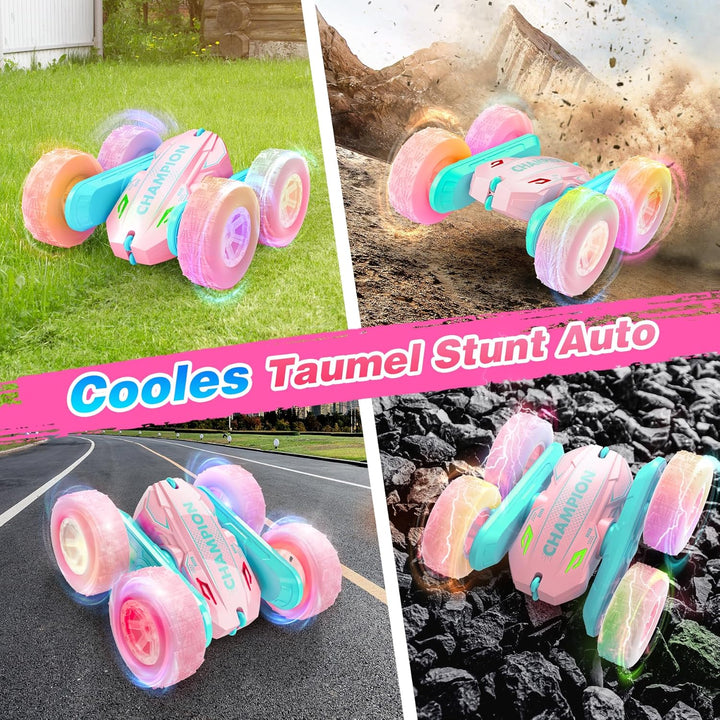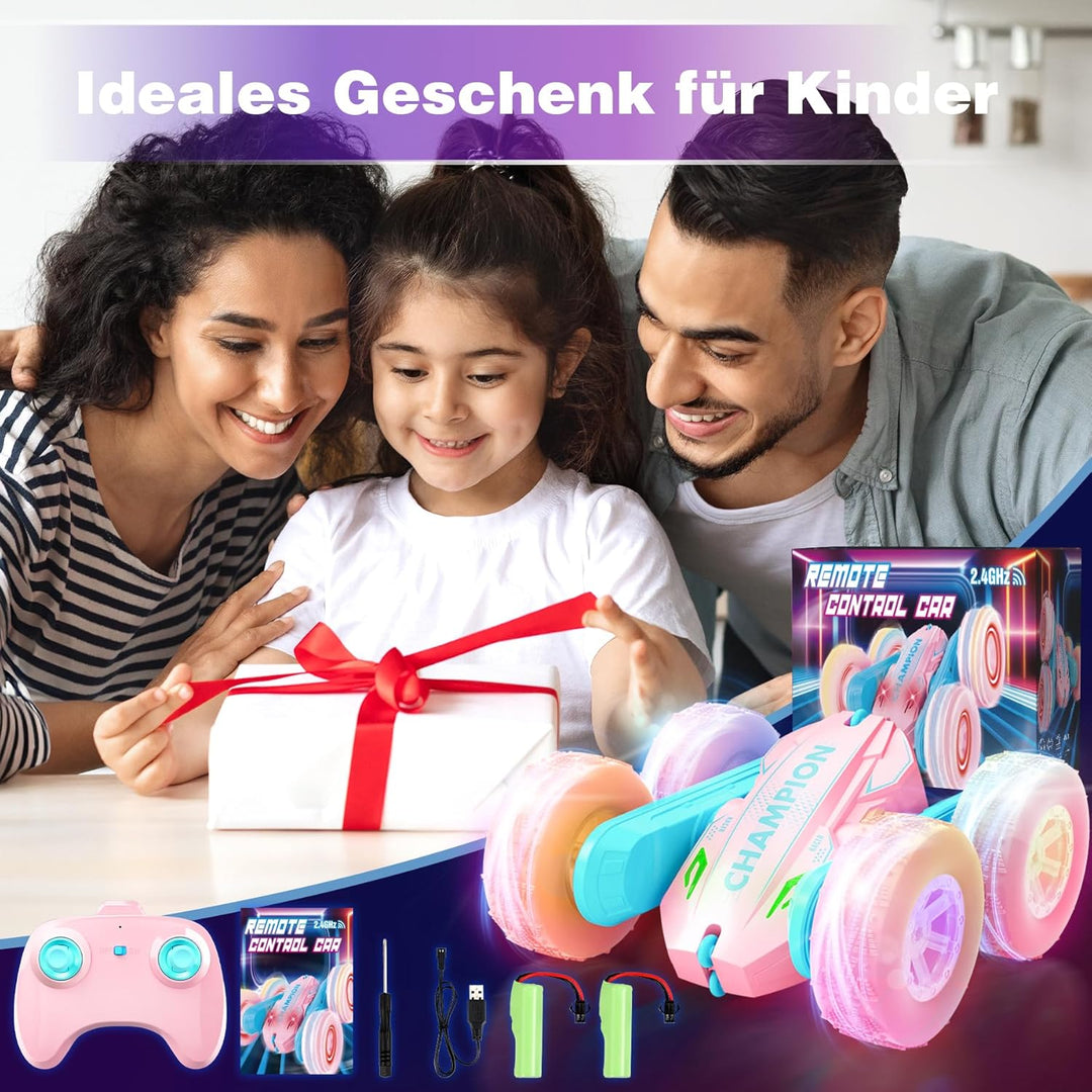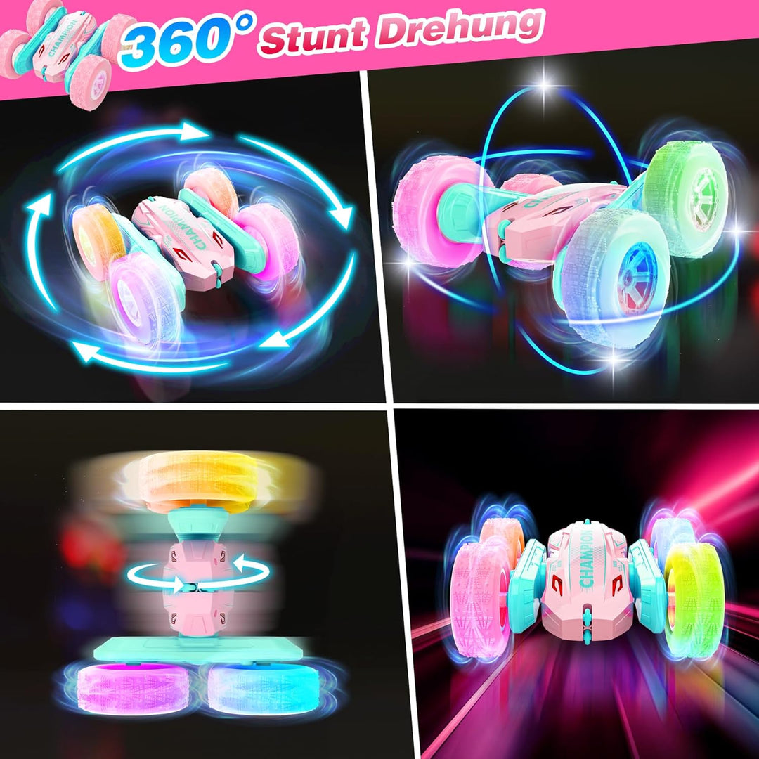 - 360° Stunts und LED-Lichter: Zusätzlich zu den Scheinwerfern ist das ferngesteuerte Auto auch mit hellen und farbenfrohen LED-Lichtern an den Rädern ausgestattet. Die blinkenden Lichter und die um 360° rotierenden Stunts machen es zu einem Auto, das