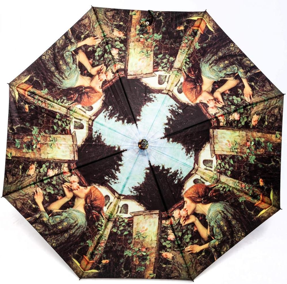 - INDIVIDUELL: Kunstvoll gearbeiteter Damen Regenschirm gross bunt nach dem Motiv des Malers John William Waterhouse. Es zeigt das Bild einer Frau, welche intensiv an einer Rose schnuppert - innig, ja fast sinnlich. Es ist fast so als könnte man den