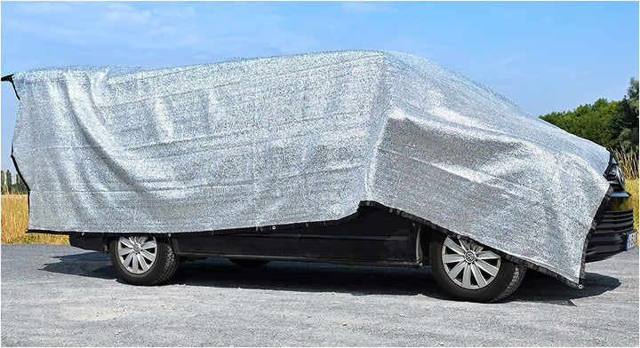 - ❄️ 𝗠𝗜𝗧 𝗞Ü𝗛𝗟𝗘𝗙𝗙𝗘𝗞𝗧 - Die gestrickte Aludecke ist luftdurchlässig, heizt selbst nicht auf und reflektiert die Sonneneinstrahlung zu 80% - Bester Sonnenschutz in 4x6 m mit Kühleffekt für den Hund.