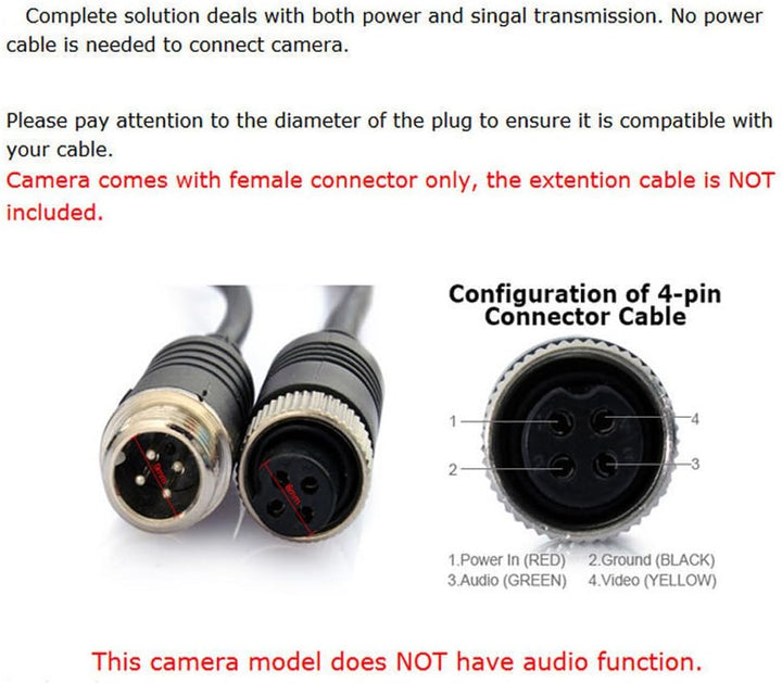 - Rückfahrkamera + 10 m Kabel: mit einem wasserdichten 4-poligen Luftfahrtstecker. 1/4 "CMOS-Kamera, digitale Signalprodukte mit hoher Transparenz, Kontrastfarbe und Bildschärfe. Hinweis: Unterstützt nur AHD-Display-Verbindungen. Wenn es zu einem schwarzen Bildschirm kommt, wenden Sie sich bitte an unseren Verkäufer, um Hilfe zu erhalten.