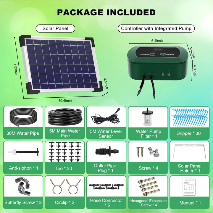 - 【WAS SIE ERHALTEN】: Das Tropfbewässerungssystem Set umfasst 5W Solarmodule,integrierter Wasserpumpen-Timer, 30 m Schlauch, 5 m Hauptwasserrohr, 30*Erdungsstecker,30*Dünne Wasserleitung T-joints, 5*Dickes Wasserrohr T-joints, Anti-Siphon, Filter,