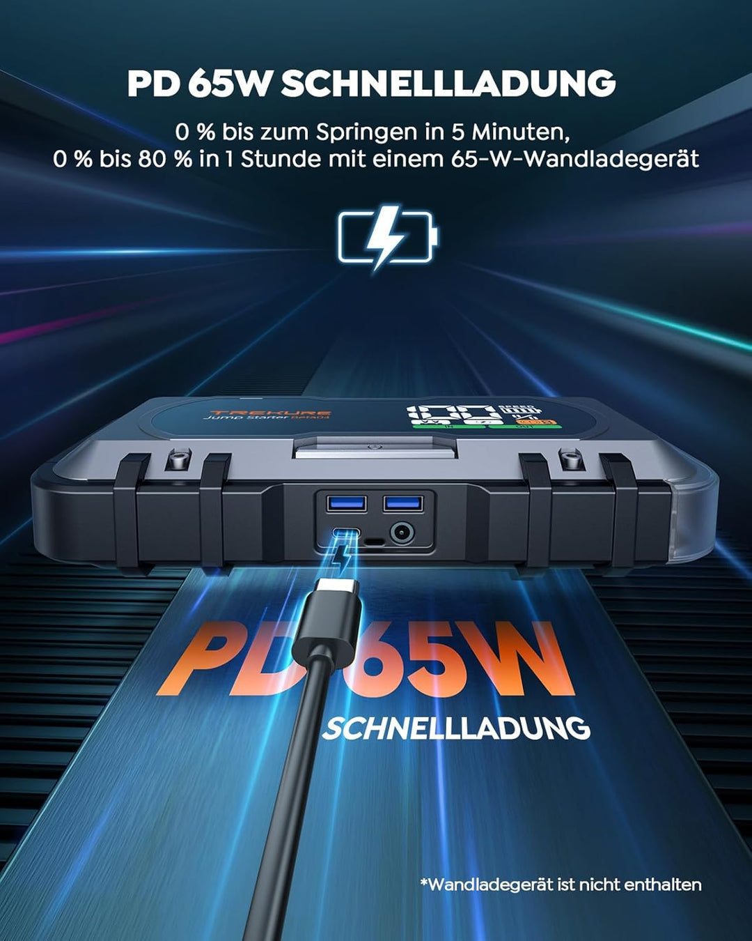 - đă65W Eingang/Ausgang Schnellaufladung ăMit 65W USB-C IN/OUT Bi-Directional Speed Charge Tech, braucht der Auto Starthilfe Powerbank nur 1 Stunde, um von 0% auf 80% aufzuladen. Starten Sie Ihr Auto in nur 5 Minuten mit einer Schnellladung. Und