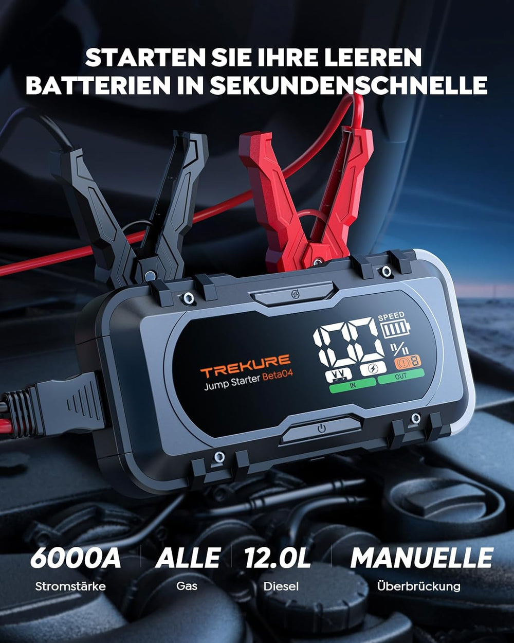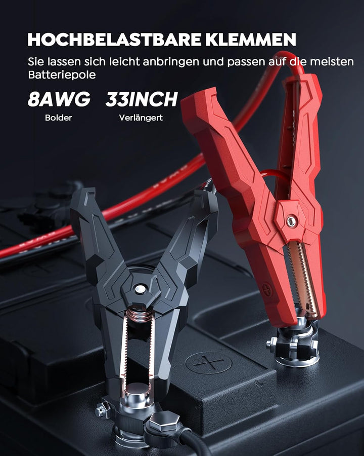 - đă6000A Leistungsstarke Auto StarthilfeăMit einer beeindruckenden Spitzenleistung von 6000A kann es fast jedes Fahrzeug auf der Strasse starten, einschliesslich aller Benzin und 12L Dieselmotor! Der Leistungsstarke Auto Starthilfe startet Ihr Auto