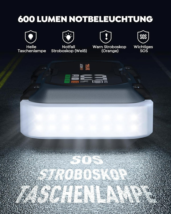 - đăUltrahelle LED-Leuchten mit 4 ModiăDas Auto Starthilfe ist ausserdem mit 600 Lumen hellen, weitreichenden LEDs ausgestattet, die zwischen Beleuchtungs-, Blitz- ,Orangefarbenes Blitz- und SOS-Modus umgeschaltet werden kann. Ein Beleuchtungs fĂŒr