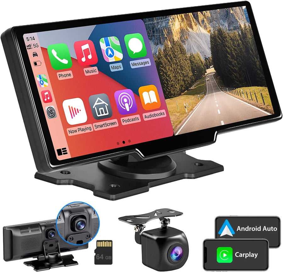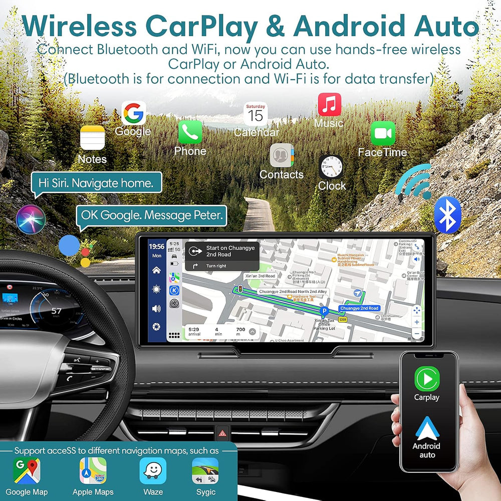 - 🚘【Suport Wireless CarPlay & Android Auto】No need to use a data cable, just turn on Bluetooth and WiFi to connect, and carplay or android auto will automatically connect next time. You can use voice control like wake up Siri or Google Assistant, open maps, play music or answer calls through voice control, allowing you to focus more on road driving.