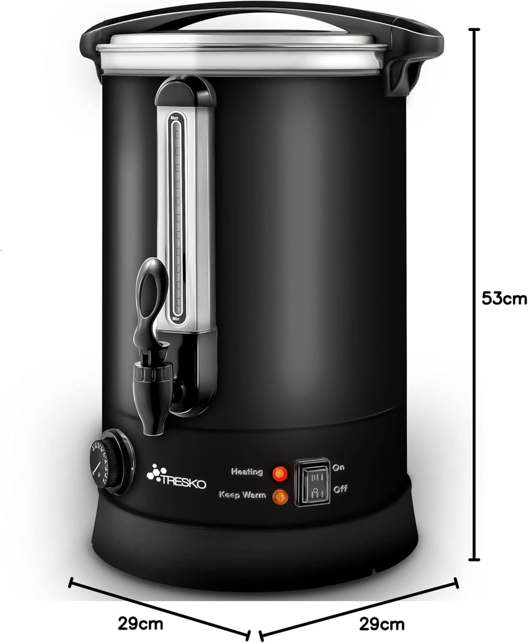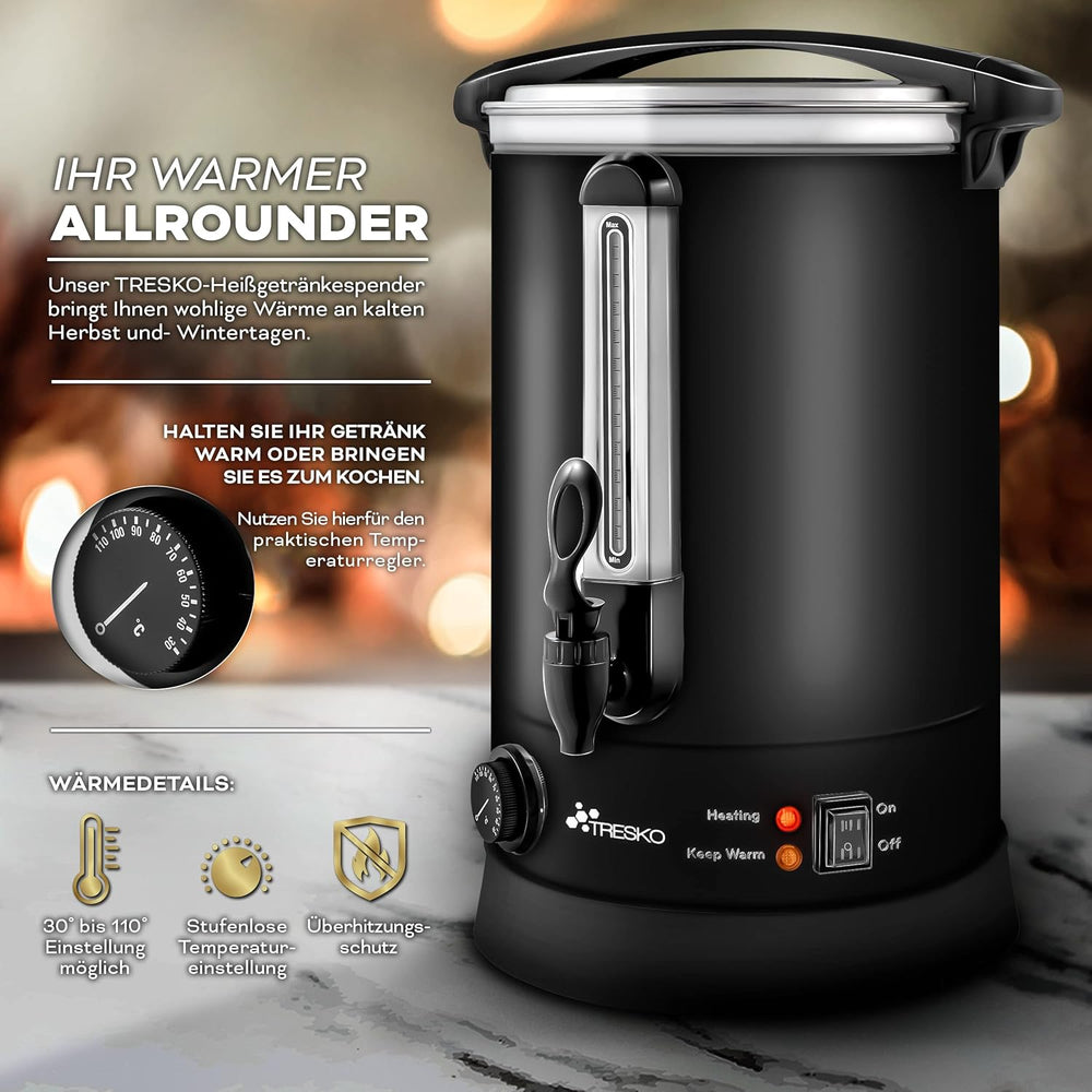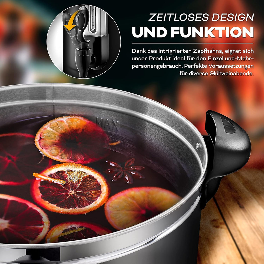 - Aufkochfunktion und Warmhaltefunktion für bis zu 6,8 - 30 Liter Glühwein. Die Füllstandsanzeige erlaubt ein zuverlässiges Ablesen der vorhandenen Restmenge.