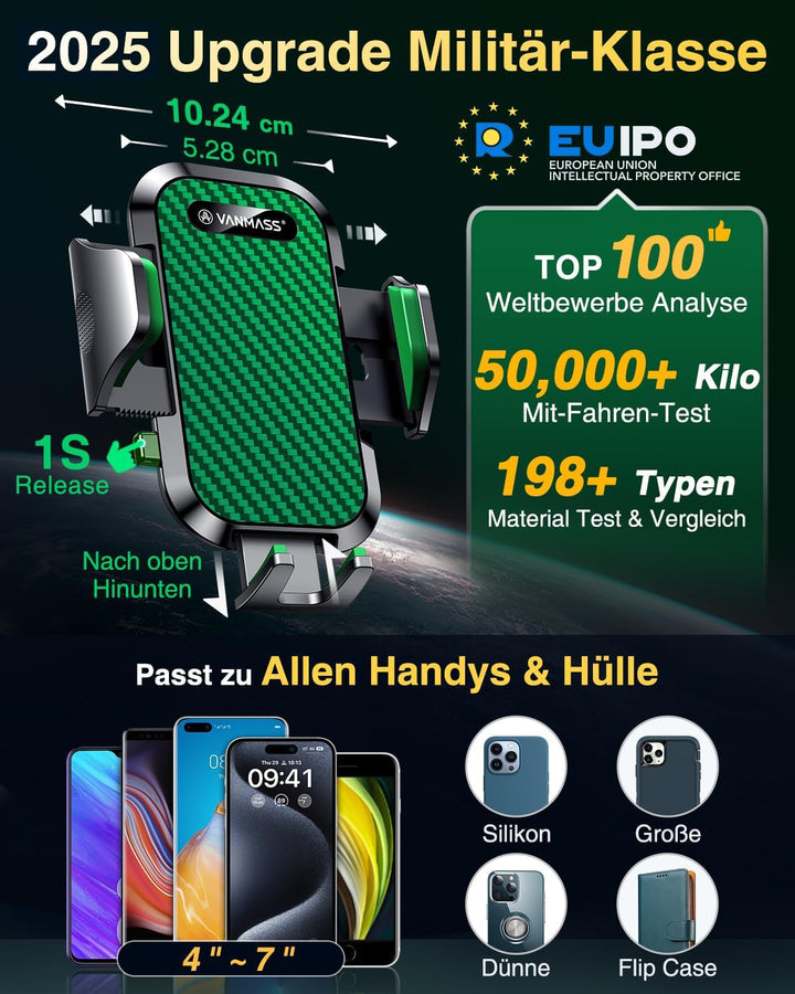 - Geniessen Sie die höchsten Standards - VANMASS Kfz Handy Halter führte über 3000 Umfragen und Top-100-Produktanalysen durch und hörte sich die Stimmen von über 6.500.000 Benutzern an, hat die Sicherheitszertifizierung von EPUIO, CP65, REACH, ROHS