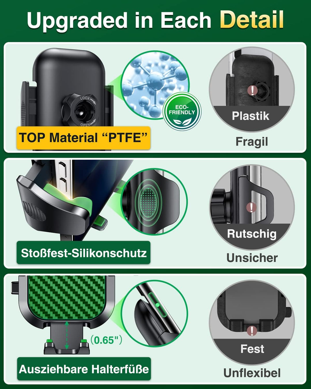 - Eine Taste für Einhandbedienung - Wenn Sie das Handy aus der Halterung nehmen möchten, wird nur ein Taste benötigt, um es mit den intelligenten Greifarmen und Stützfüssen zu entsperren. Somit ist Ihr sicheres Fahren garantiert und Ihre Zeit wird