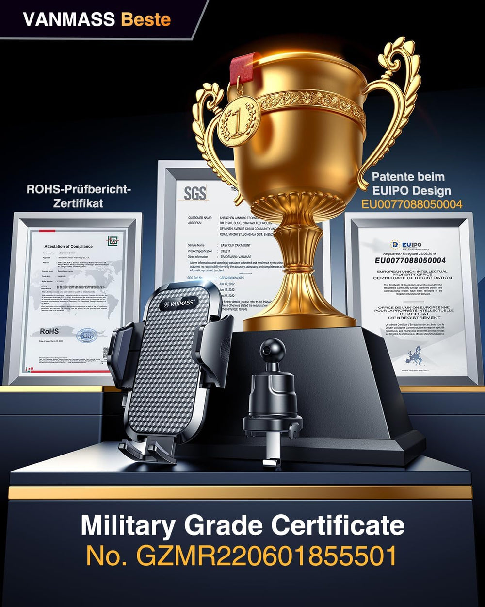 - [Grossmeister Design & Top Konfiguration] -Nach 6 Jahre Konzentration auf Halter-Bereich ist VANMASS 2022 neueste Version Auto Handyhalterung endlich gebohren, Auf der Grundlage von mehr als 4.500 Kundenumfragen und Analyse von Top 100 Produkte haben wir diese Halterung entworfen und ergänzt. Hergestellt aus Luftfahrtmaterial "PTFE" für maximale Haltbarkeit und Zuverlässigkeit. Diese Handy Autohalterung hat 2 Patent in der EUIPO gewonnen und mit RoHS, REACH und CP65 zertifiziert.