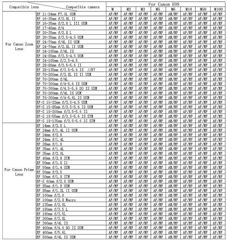 - Kompatibilität: Mit diesem Objektivadapterring können Canon EF-Objektive mit Digitalkameras mit Wechselobjektiv kompatibel sein, die mit EF-M-Objektiven kompatibel sind. Bitte kontaktieren Sie uns, wenn Sie nicht sicher sind, ob dieser
