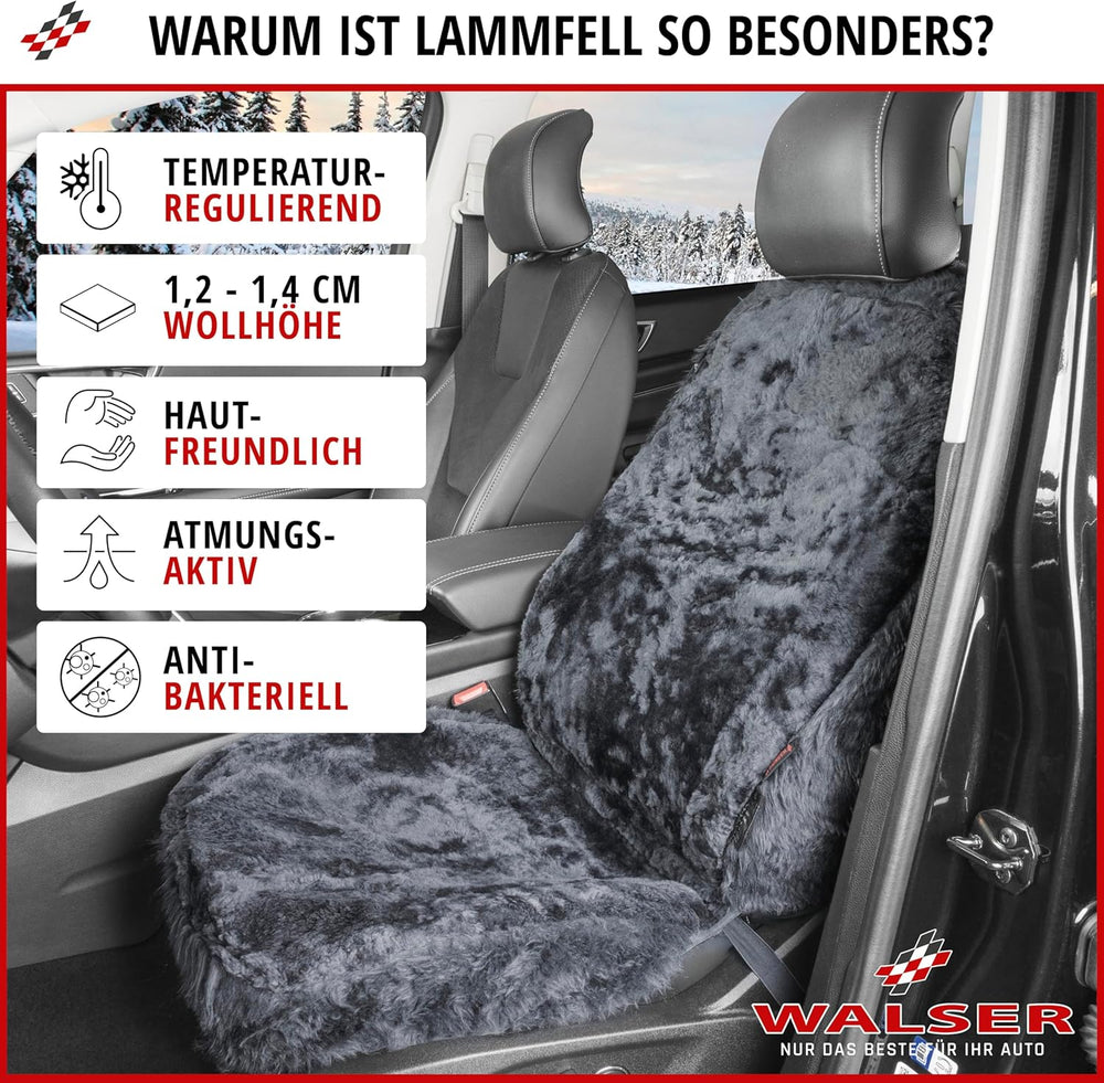 - WOHLFÜHL-PRODUKT: Der hochwertige WALSER Lammfellbezug Auto sorgt für maximalen Komfort im Auto. Der kuschelig, weiche Auto Lammfell Sitzbezug ist hautfreundlich, atmungsaktiv und wirkt temperaturregulierend. Der antibakterielle Fellbezug sorgt im