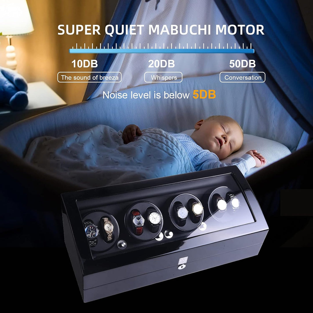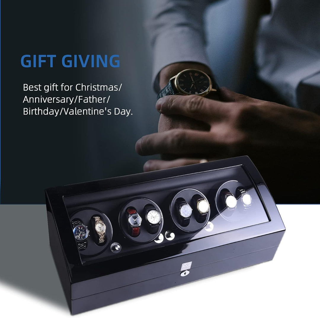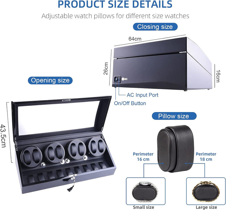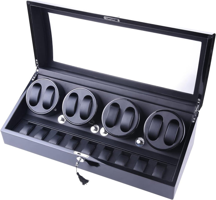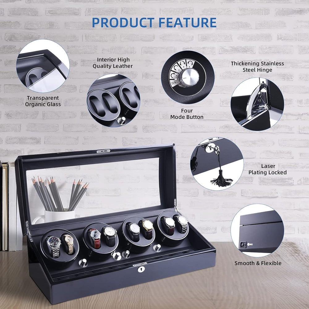 - ❤【Kapazität】 Der automatische Uhrenbeweger kann bis zu 8 Uhren gleichzeitig wickeln, was maximale Flexibilität und Vielseitigkeit bietet. Das vordere Fach des Wicklers hat Aufbewahrungsmöglichkeiten für weitere 9 edle Uhren oder Schmuck und einen Qualitätsschlossmechanismus, um Ihre Uhren sicher zu halten.