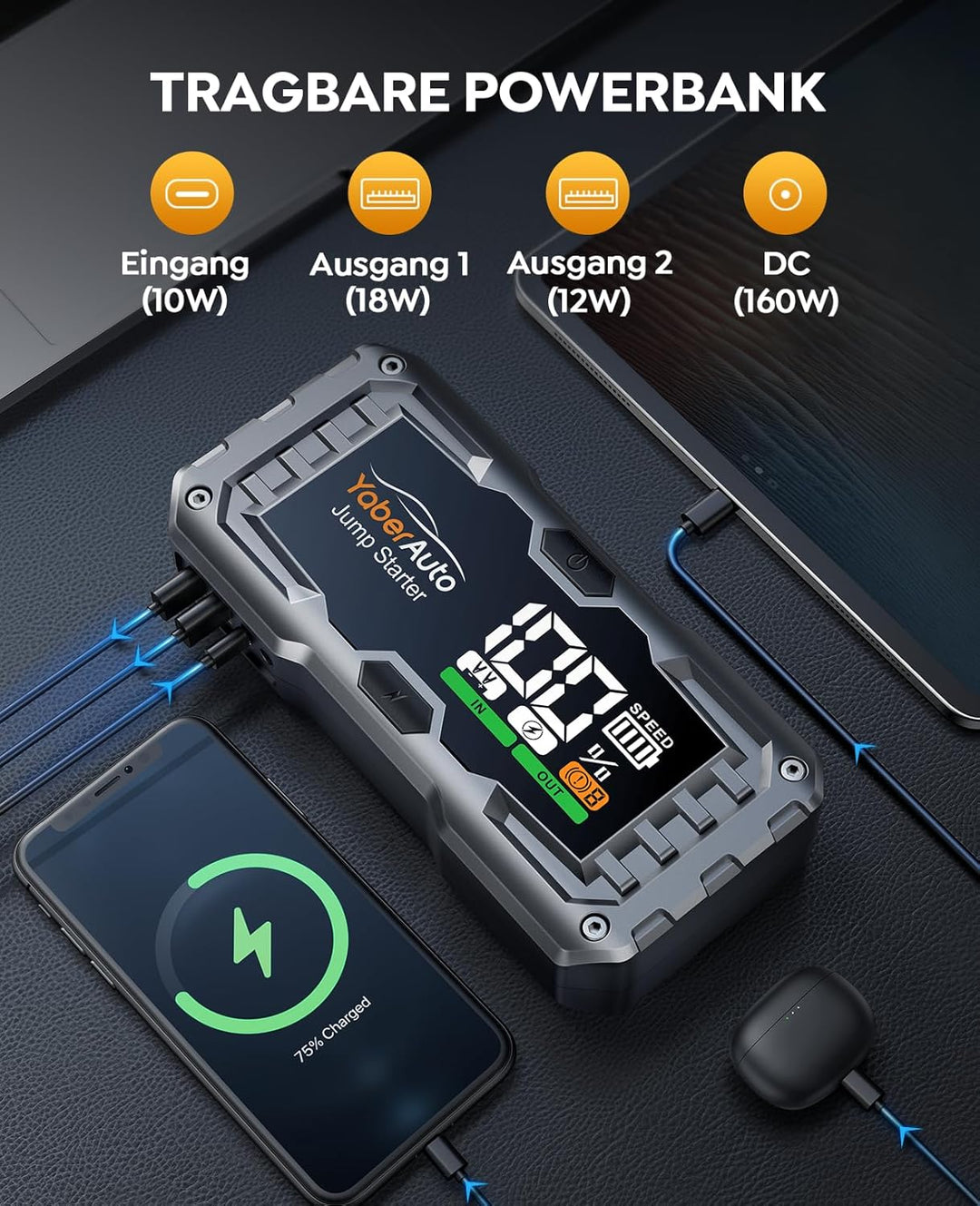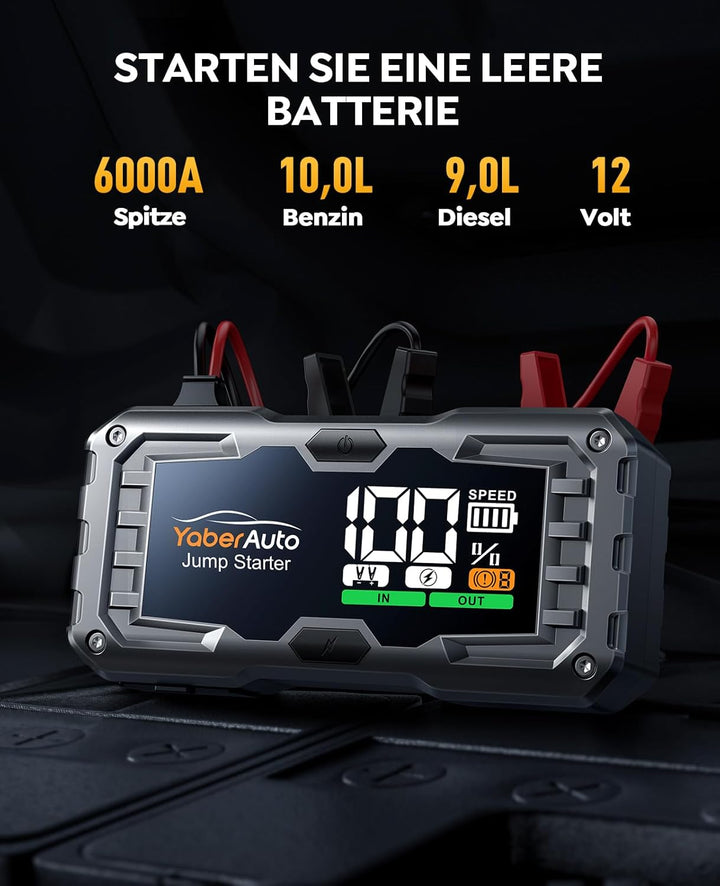 - 【Produktsammlung】 :YaberAuto YA100 Auto Starthilfe、Robuste Überbrückungskabel、USB-C Ladekabel、DC-Zigarettenanzünder-Adapter、Benutzerhandbuch、Tragbare Aufbewahrungstasche、2 JAHRE Garantie und lebenslanger technischer Support. Wenn Sie