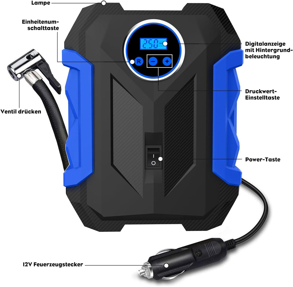 CARSUN Luftpumpe Auto,12V Mobiler Kompressor Auto,150PSI Autoreifen Pumpe mit Reifendruckmesser und