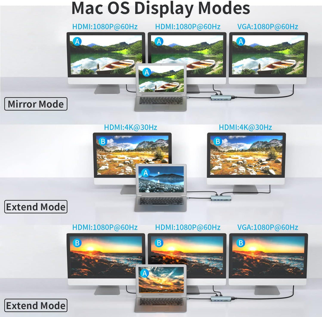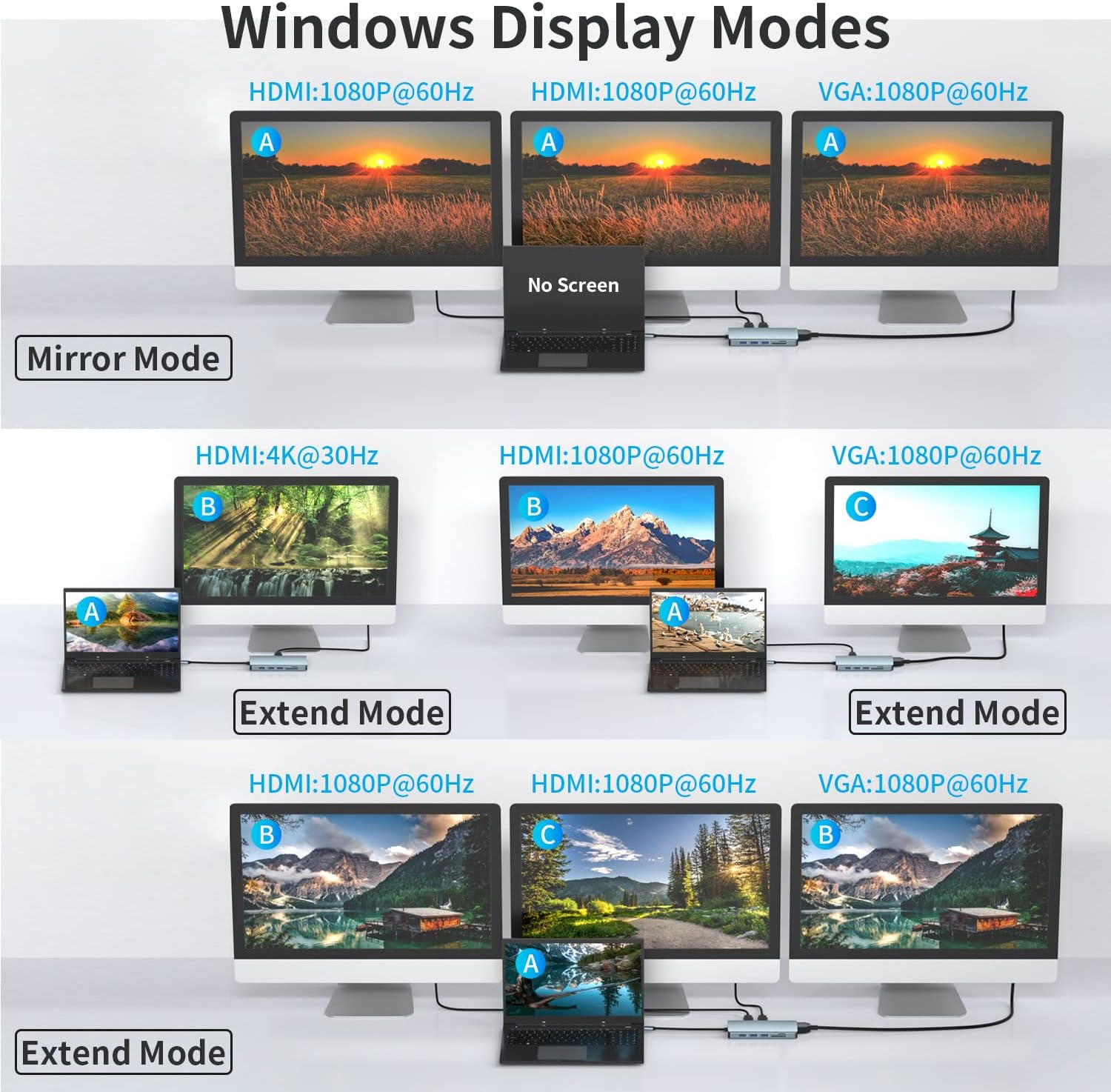 - 【Dreifache Anzeige von WINDOWS】 Dreifache Anzeige: HDMI+HDMI+VGA, aber nur Windows-System unterstützt dreifache Anzeige; Mac-Betriebssystem wird nicht unterstützt. Streamen Sie 4K Ultra HD- oder Full HD 1080P-Videos für ein Kinofeeling. Bei