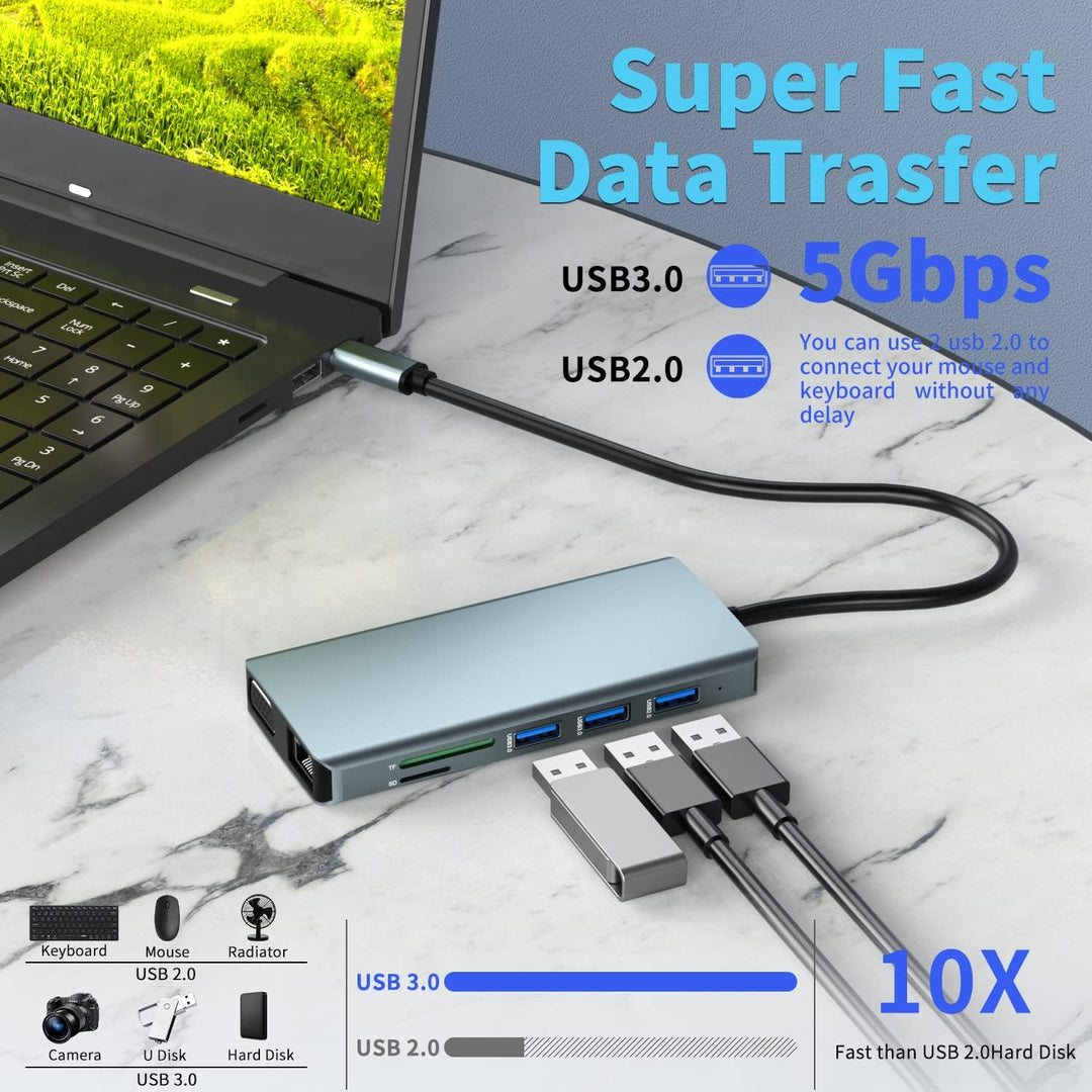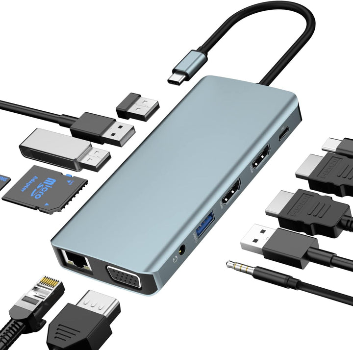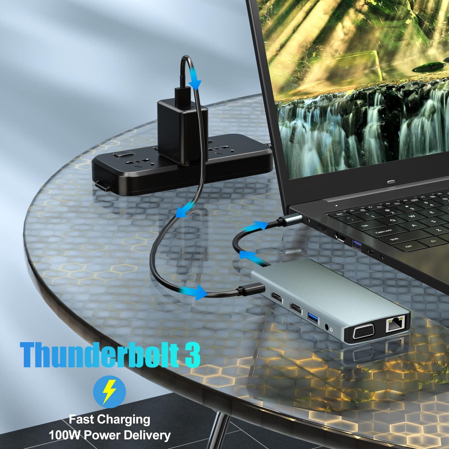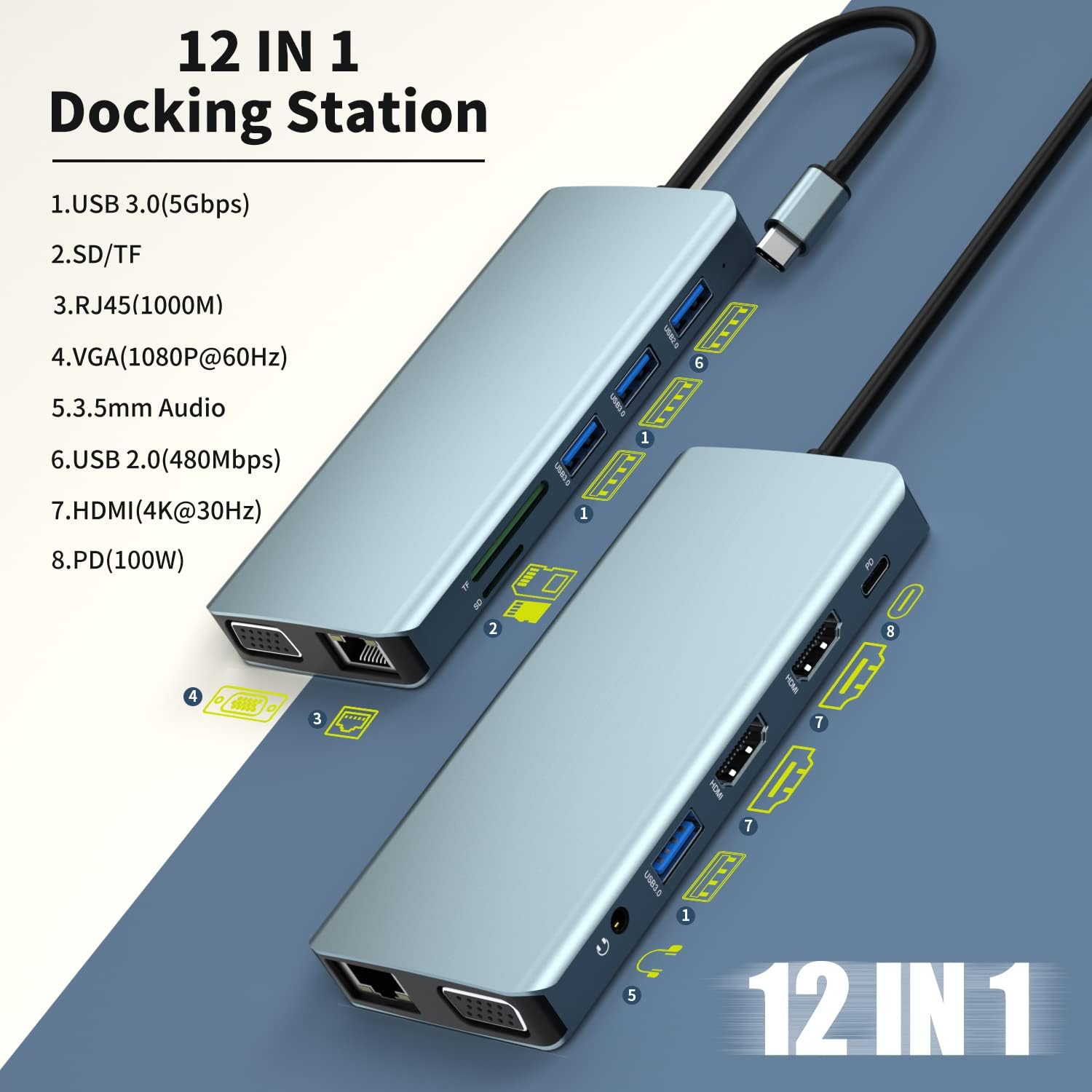 - 【12-in-1-USB-Dockingstation】 Dieser USB-C-Hub verfügt über HDMI, VGA, adaptives 10/100/1000M-Ethernet, 3,5-mm-Stereo-Audioeingang und -ausgang, SD- und TF-Kartenleser, 3 USB 3.0 (Super Speed 5 Gbps ) für Abwärtskompatibilität, 1