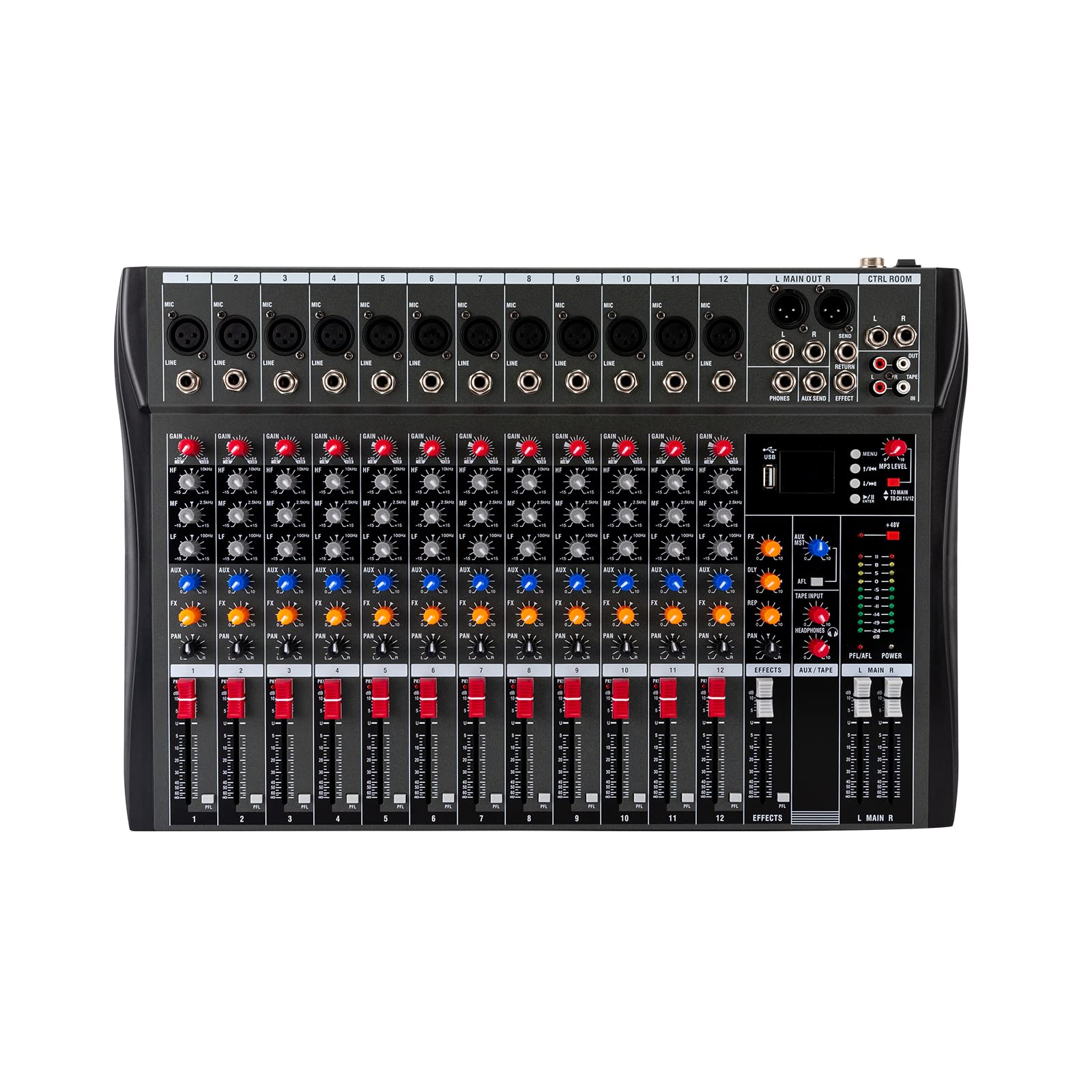 - 12-Kanal Mikrofoneingang: Der Audiomixer eignet sich sehr gut für den Anschluss mehrerer Geräte, da er über 12-Kanäle verfügt. Gleichzeitig werden verschiedene Audiosignale fein verarbeitet, um exzellenten Klang zu erzielen.
