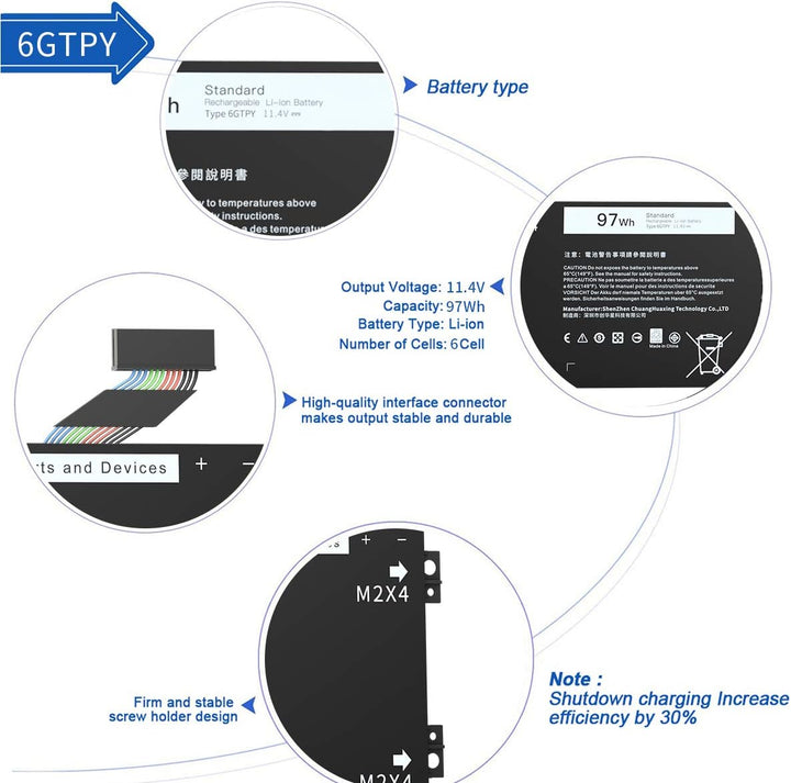 - 【Batteriespezifikationen】 Artikelmodell: 6GTPY; Produkttyp: Ersatzbatterie; Batterieart: Li-Ion; Anzahl der Zellen: 6 Zellen; Spannung: 11,4 V; Kapazität: 97WH.