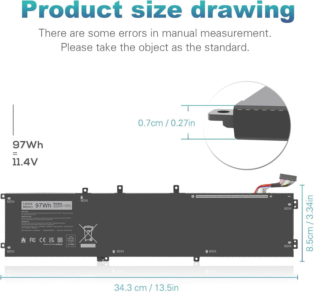 - 【Spezifikation】: Die Grösse ist 34.3 x 8.5 x 0.7CM. Die Kapazität beträgt 97Wh und die Spannung ist 11.4V. Der brandneue Akku bringt Ihrem Laptop wieder Vitalität.
