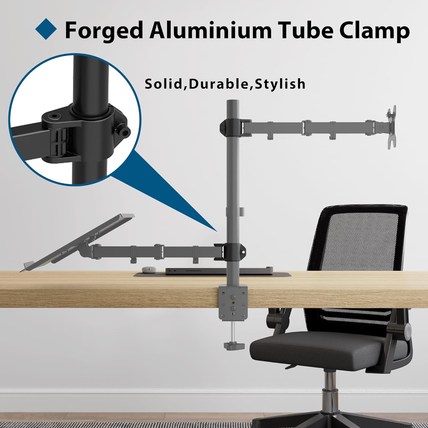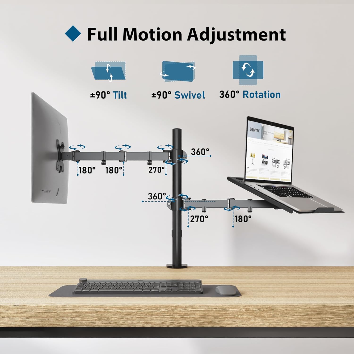 - Volle Beweglichkeit einstellbar: Der Monitor laptop halterung ist auf einer robusten Säule montiert und höhenverstellbar: der Distanz von der VESA-Platte zum Desktop kann von 0 bis 43,4 cm verstellt werden. Platzieren Sie Ihre beiden Monitore auf zwei verschiedenen Höhen. Es gibt 2 Gelenke für jeden Arm, mit denen sie um 180° gedreht werden können. Die VESA-Platte kann um 360° geschwenkt und um 360° gedreht und von + 90° bis - 90° gekippt werden, was eine hervorragende Flexibilität gewährleistet