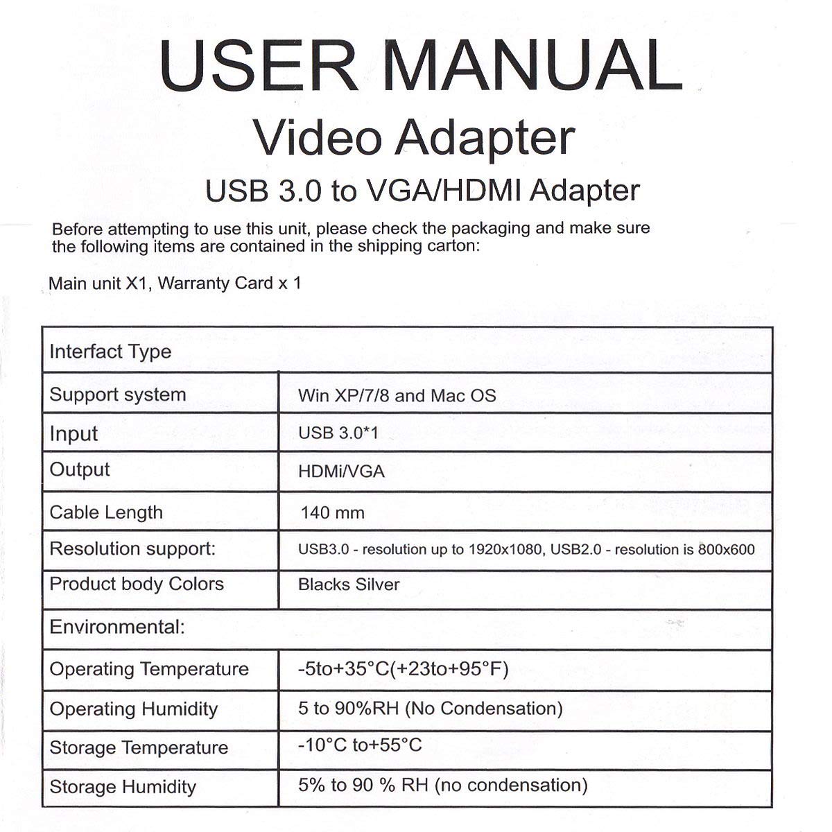 - USB 3.0 auf HDMI und VGA ermöglicht es Ihnen, von Ihrem USB-3.0-Windows-Computer oder Grafikkarte mit Ihren externen Displays mit HDMI- und VGA-Buchse (einschliesslich HDTV, Projektoren, Monitore) über ein HDMI- oder VGA-Kabel zu verbinden.