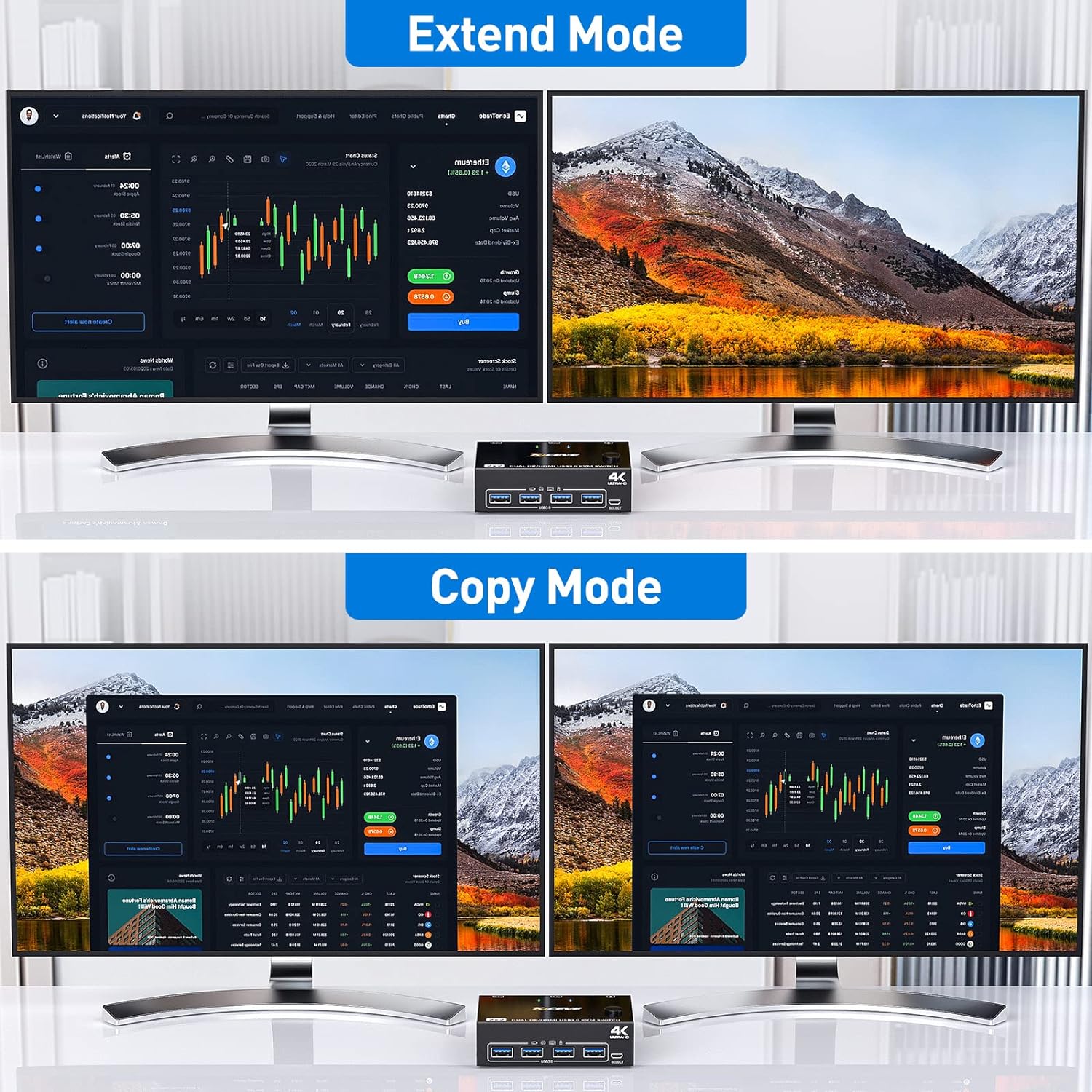 - 【HDMI + DP Schnittstelle KVM Switch】 Dies ist ein perfekter KVM-Switch für DP und HDMI schnittstelle geräte, um Tastatur, Maus und Monitor gemeinsam zu nutzen. Im Kopiermodus kann der Hauptbildschirm auf den zweiten Ausgabebildschirm kopiert