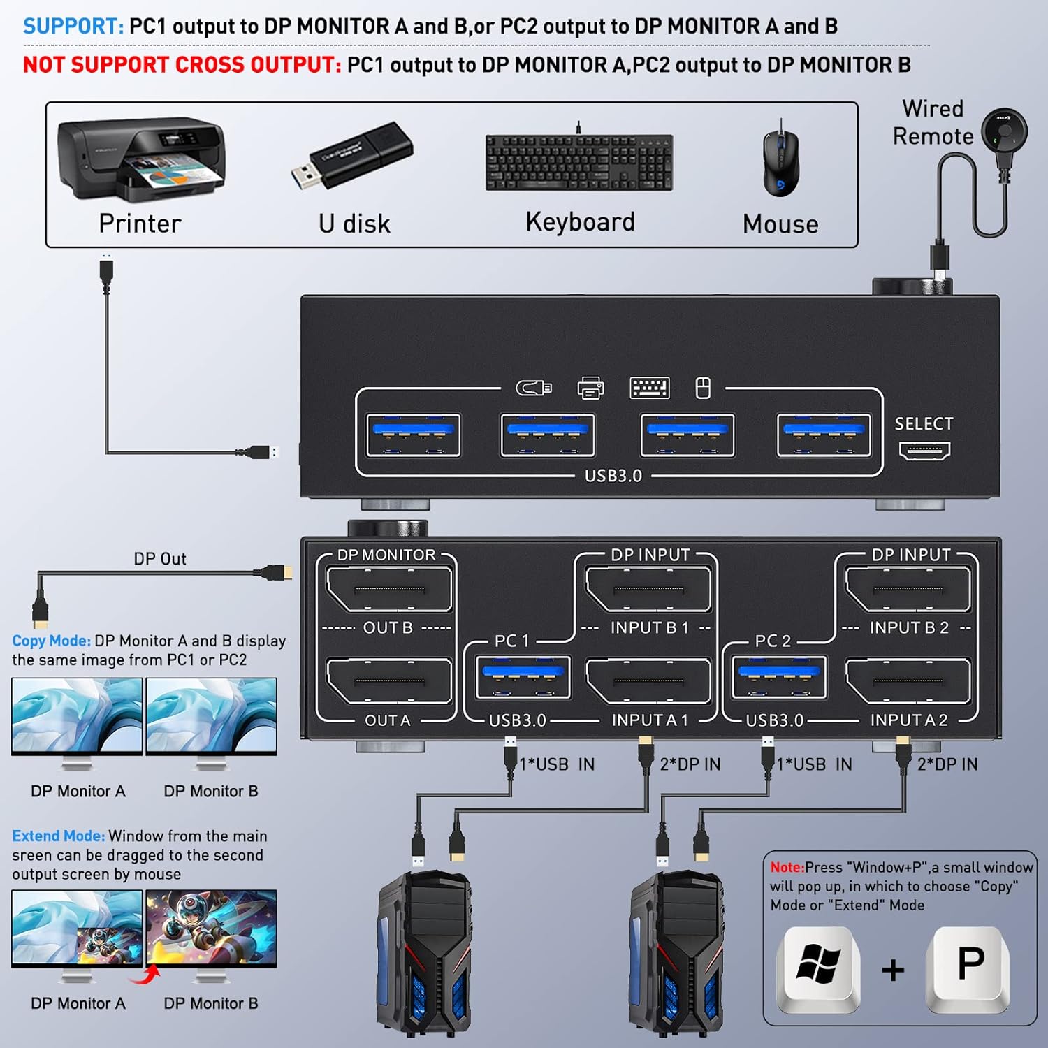 - 【2x Displayport input + 2x Displayport output】 Dieser DP-KVM-Switch ermöglicht dem Benutzer die Steuerung von 2 DisplayPort-Computern über eine einzige Tastatur, Maus und einen 4K-Monitor. Mit 4 USB 2.0-Anschlüssen zur gemeinsamen Nutzung von