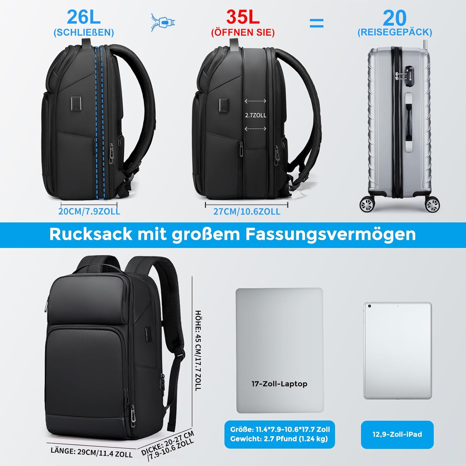 - 【ERWEITERBARES DESIGN】Abmessungen: 17,7 x 11,4 x 7,9~10,4Zoll. Es bietet viel Platz und Taschen für alles, was Sie mitnehmen müssen. Sie können Ihre Powerbank und USB-Kabel in verschiedenen Schichten verlegen. Das gepolsterte Computerfach bietet