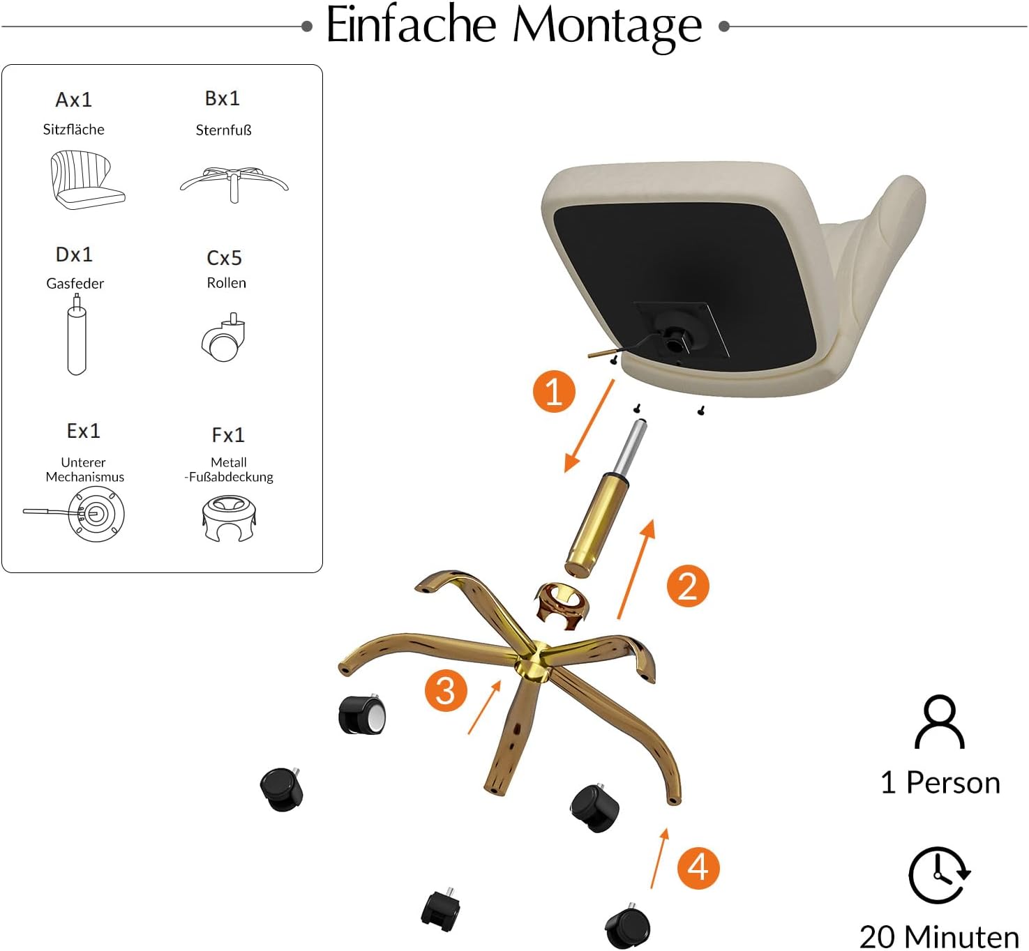 - Einfache Montage: Montieren Sie Ihren neuen Schreibtischstuhl für das Schlafzimmer schnell und mühelos mit der mitgelieferten Montageanleitung. Geniessen Sie den Komfort und den Stil Ihres Stuhls innerhalb von 5-10 Minuten. Wenn Sie Fragen zu unseren