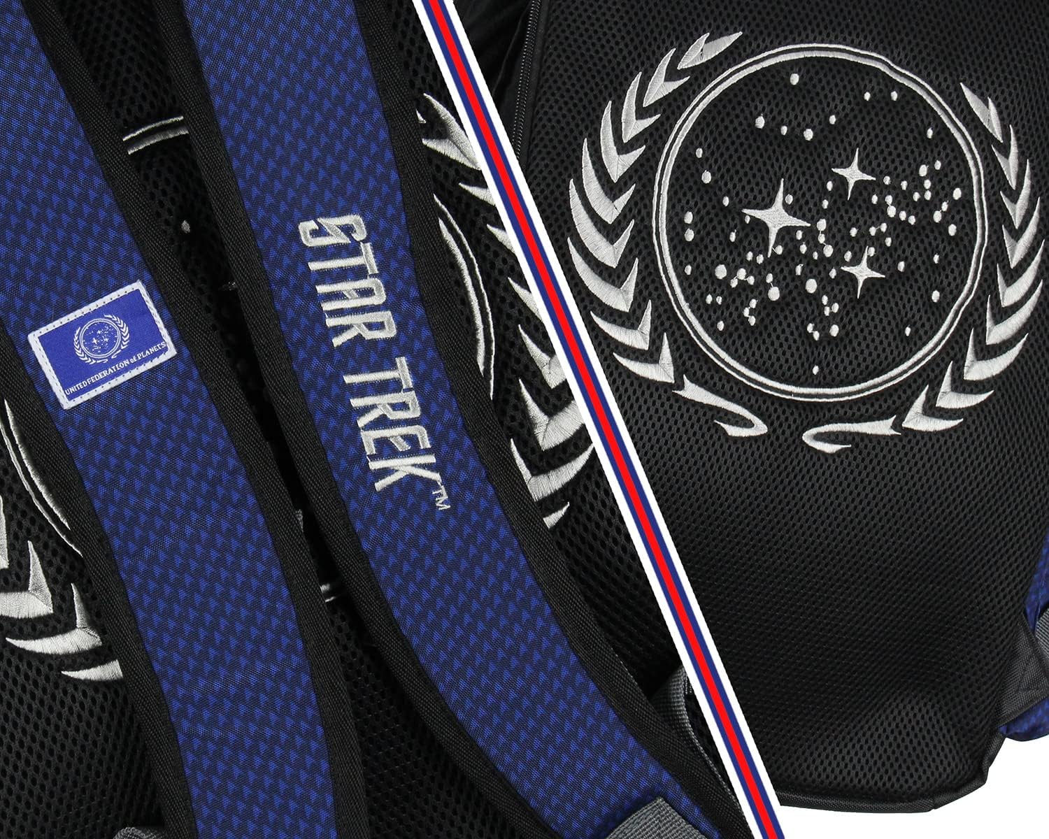 PRODUKTBESCHREIBUNGEN Dieser Star Trek Rucksack ist perfekt für alle Ihre Weltraumreisen! Es verfügt über ein gesticktes Sternenflotten-Akademie-Abzeichen. Der Rucksack verfügt über mehrere Patches mit dem gleichen Starfleet Academy Logo wie im Laufe der Jahre auf der Show abgebildet. Auf einer der Seiten zeigt es "Est. 2161." Der Rucksack verfügt über viele Taschen im Cargo-Stil, darunter zwei Seitentaschen und eine kleinere auf der Vorderseite, die perfekt für alle Ihre Star Trek-Waren geeignet sind. Es verfügt auch über eine innere Laptophülle im Haupt-Rucksack und ein Rolltop mit Schnallen. Es bietet auch verstellbare Träger im Rücken für die perfekte Tragepassung! Es besteht aus einer super strapazierfähigen Polyester-Mischung, um den Verschleiss des täglichen Gebrauchs zu halten. Altersempfehlung des Herstellers: ab 3 Jahren