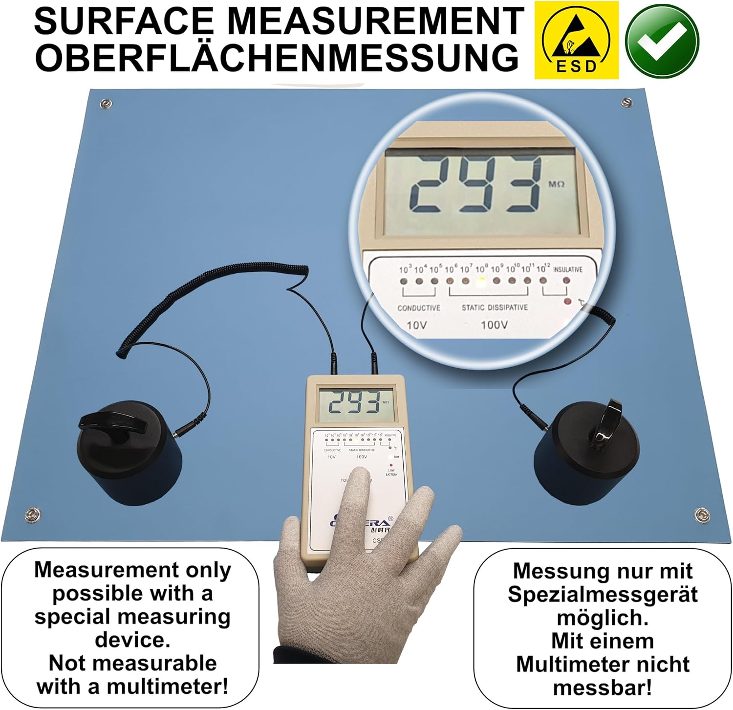 - ⚡ Ableitwiderstand zwischen 10^6 bis 10^9 Ohm – Ladungsabbau < 0,03 Sekunden