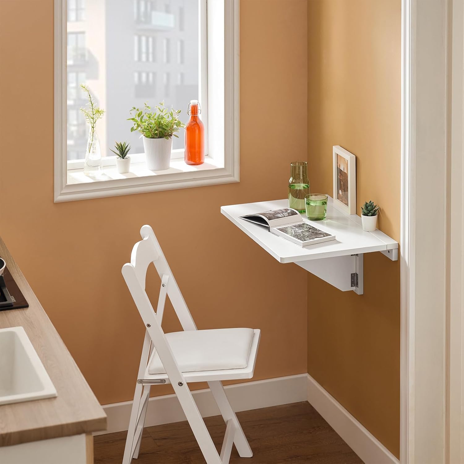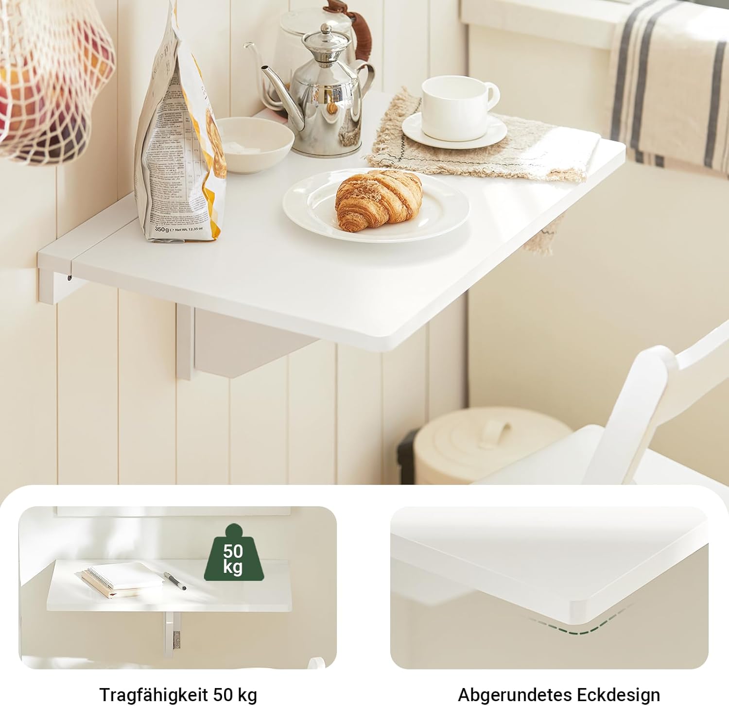 - Wird der Tisch nicht benötigt, kann er eingeklappt werden und hängt flach an der Wand, so dass er kaum Platz einnimmt.
