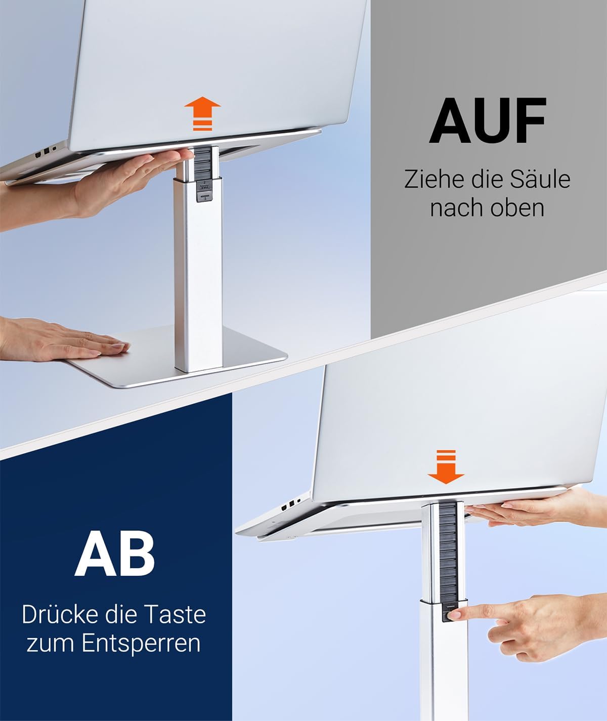 - 2-IN-1 STEH-SITZ-LAPTOPHALTERUNG: Dieser höhenverstellbare Laptop Halterung unterstützt das Arbeiten im Sitzen oder Stehen. Er kann den Laptop bis zu 15" (38 cm) anheben und bietet so eine ergonomische Lösung für alle, die lange vor ihrem Laptop