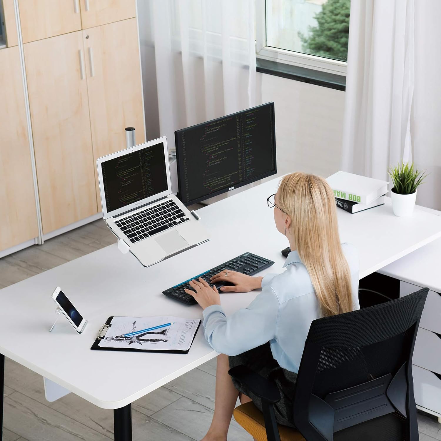 - Ergonomischer Schreibtisch: Stellen Sie Ihren Monitor und Laptop in die bequemste Position, um die Belastung von Nacken und Schultern zu reduzieren, Ihren Arbeitsbereich zu organisieren und Ihre Effizienz zu verbessern.