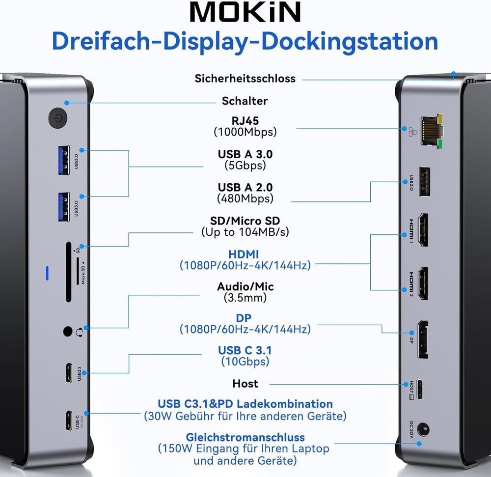 USB C Docking Station 3 Monitors, Triple Display Dock mit 2 HDMI DP 4K@144Hz, 15 in 1 Laptop Docking