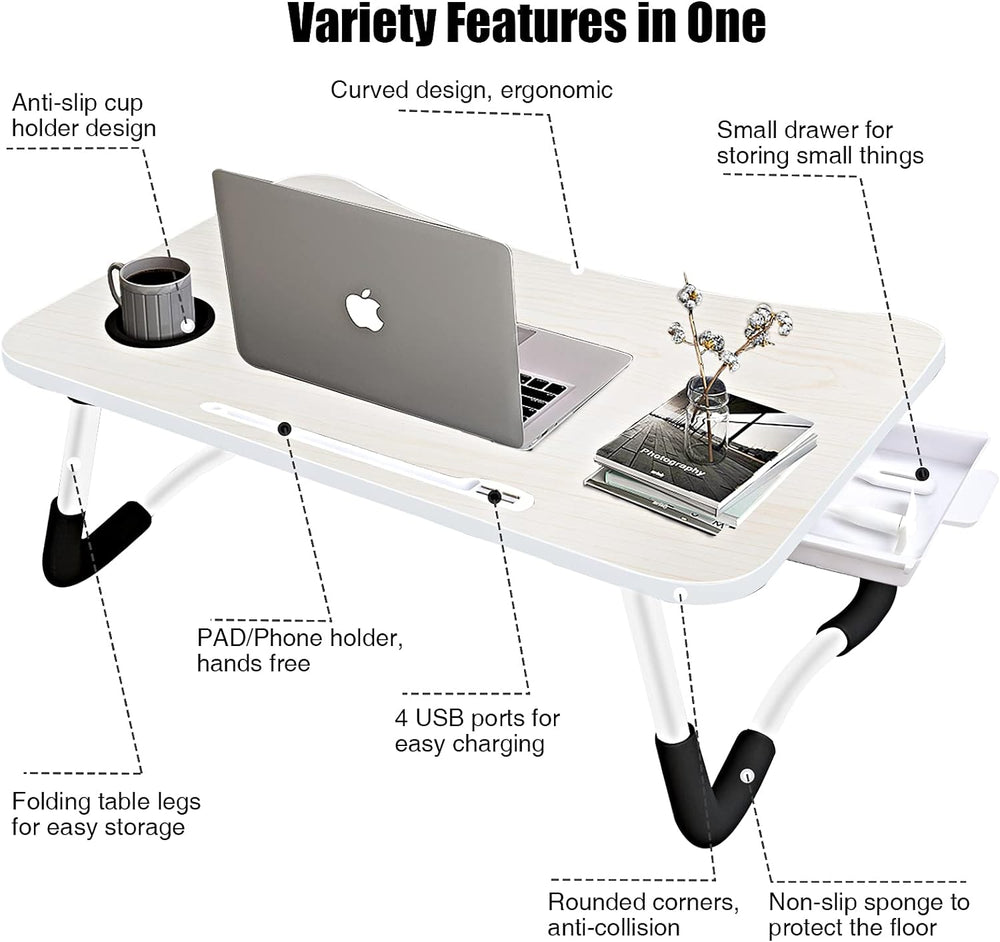 A3A ACADGQ Laptoptisch, Laptop Betttisch Klappbar, Notebook Tisch mit 4 USB Ladeanschluss, Schublade