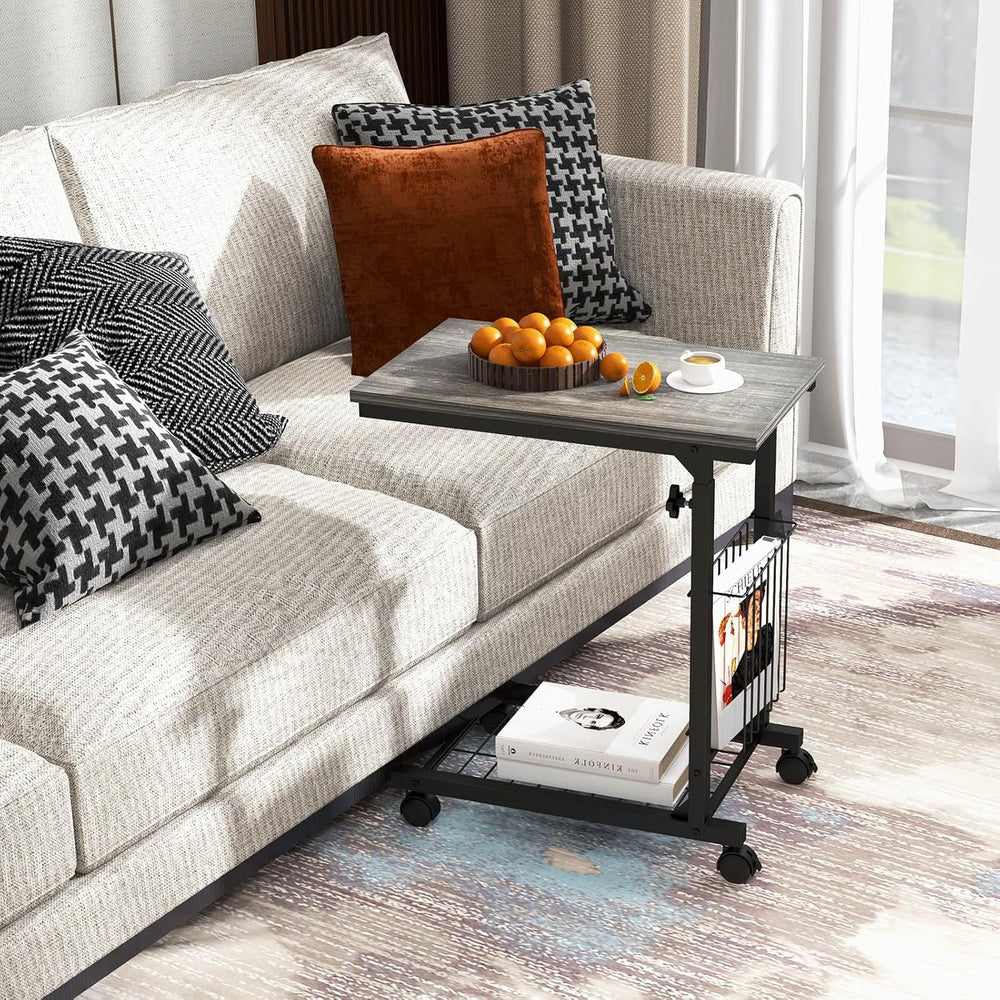 COSTWAY Beistelltisch mit Rollen, Laptoptisch höhenverstellbar, mit Aufbewahrungskorb, Sofatisch C-F