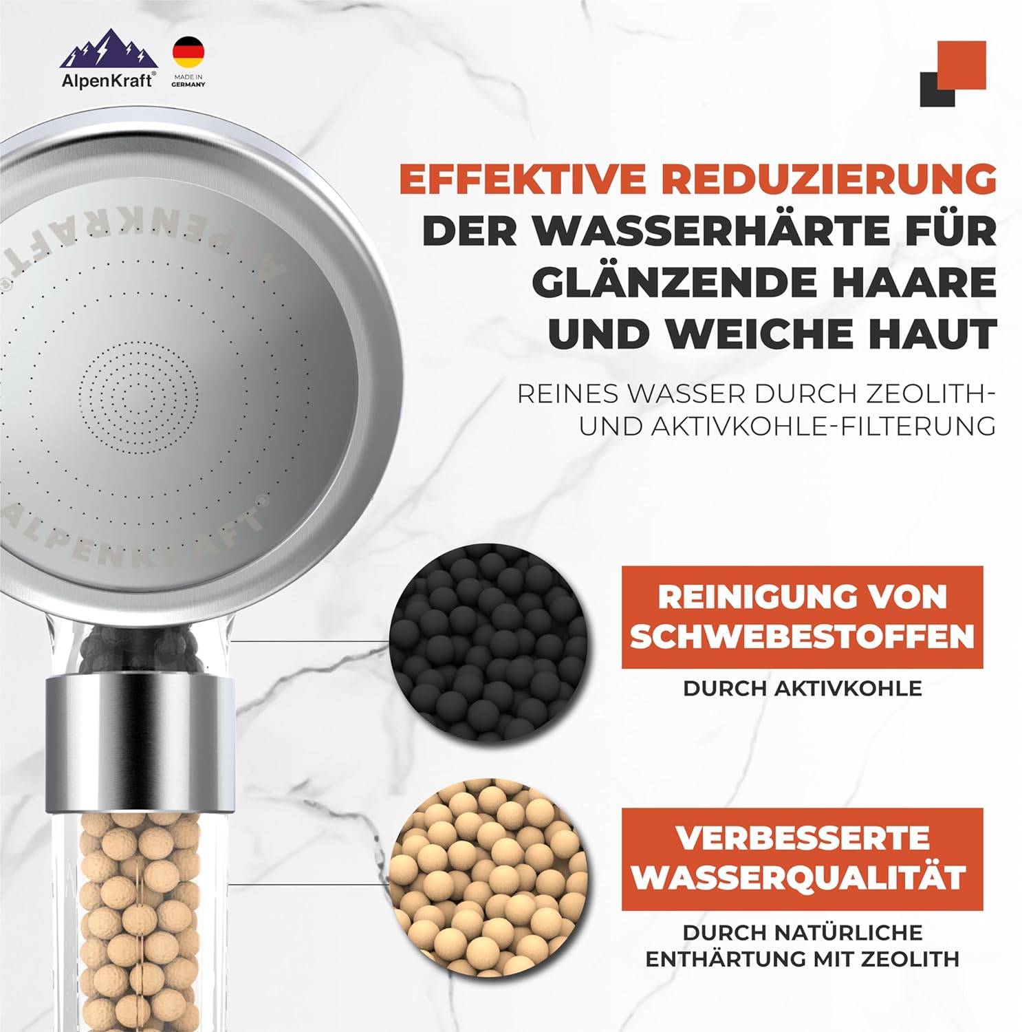 - **Einzigartige Filterung** Zeolith- und Aktivkohleperlen sorgen für glänzendes Haar, weniger Hautrötungen und weniger Wasserflecken an den Wänden.