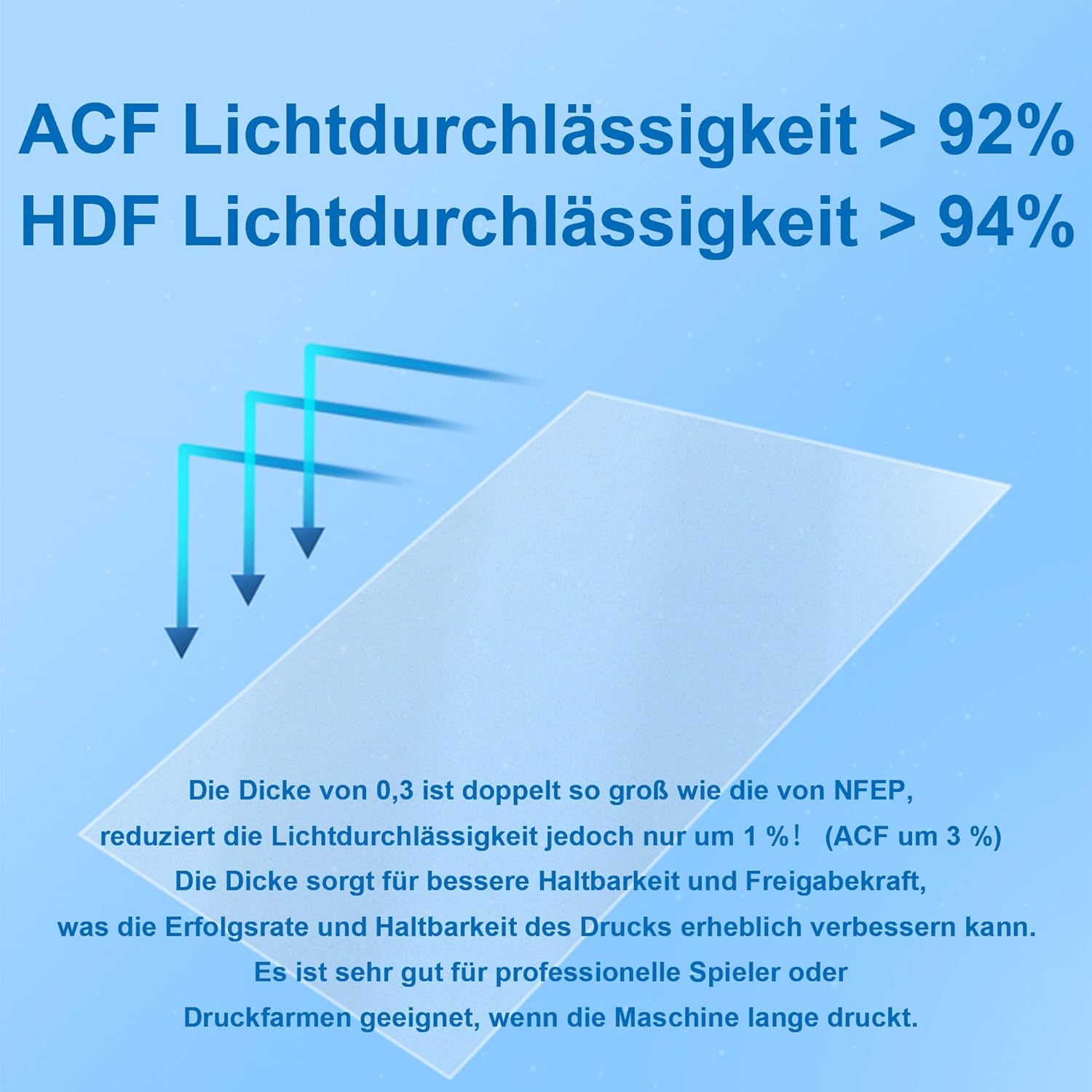 - Antinsky ACF Filme sind ein Upgrade von NFEP, die Auslösekraft ist kleiner als bei NFEP. bedeutet, dass ein schnelleres Drucken möglich ist. Nachdem Sie ein Modell gedruckt haben, reinigen Sie einfach die Folie und schon sind Sie für Ihr nächstes