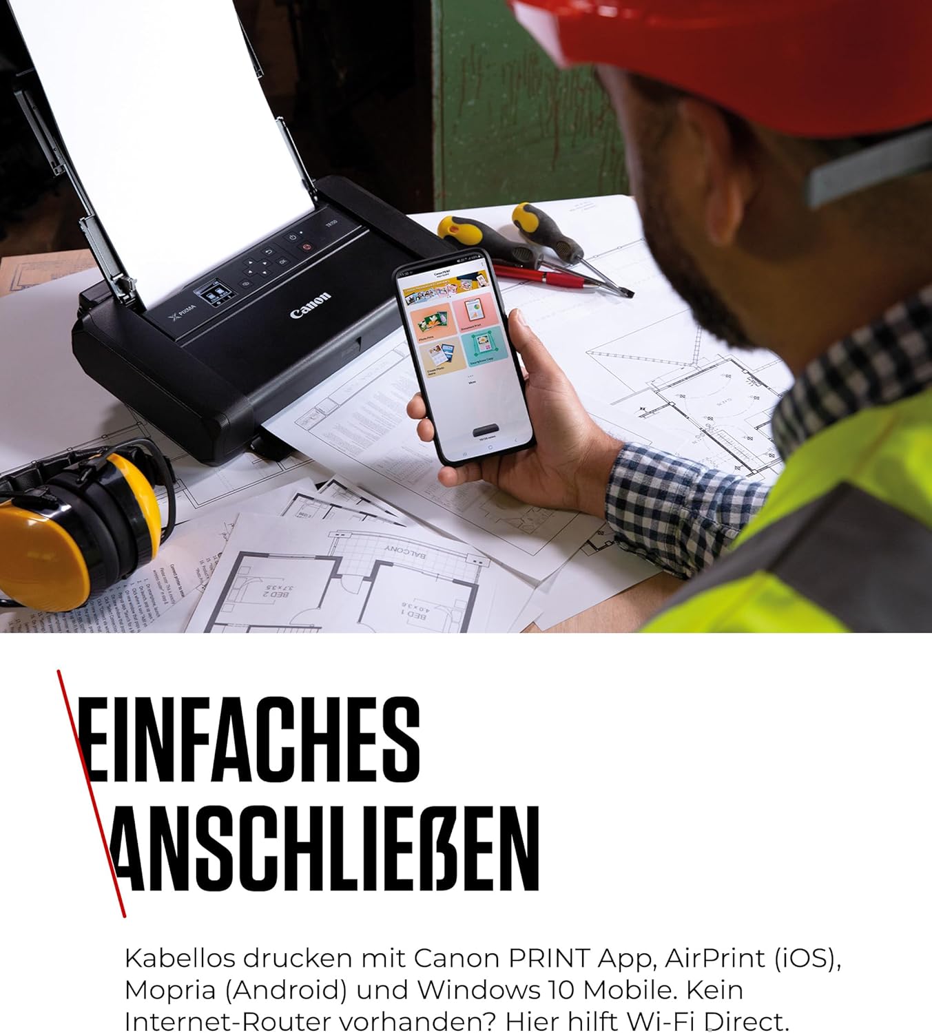 - MOBILER DRUCKER FÜR UNTERWEGS - Der PIXMA TR150 ist schlank, leicht und robust. Ideale Voraussetzungen für das mobile Büro. Alle Kabel und Verbindungen befinden sich auf einer Seite des Druckers, damit er platzsparend platziert werden kann. Zuverlässiges Drucken für Randlosfotos und Dokumente bis zum Format A4.Mit einer Druckgeschwindigkeit von 9 ISO-Seiten/Minute in S/W und 5,5 ISO-Seiten/Minute in Farbe arbeitet der Drucker leise und schnell