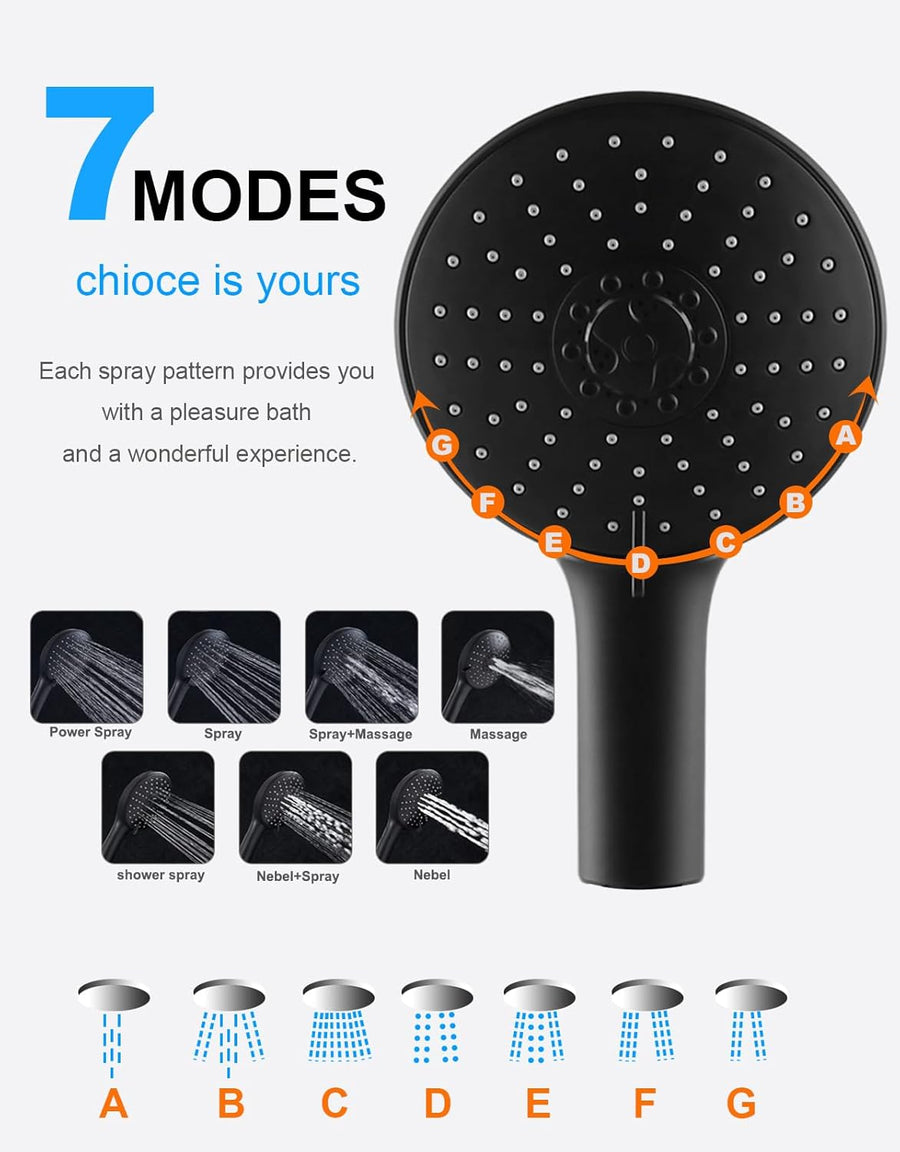 - 【 7 Strahlarten Duschkopf 】Nebel, Nebel+Spray, Spray, Power Spray, Spray + Massage, Power Spray + Nebel, Massage. Jedes Spraymuster bietet Ihnen ein Genussbad und ein wunderbares Erlebnis.