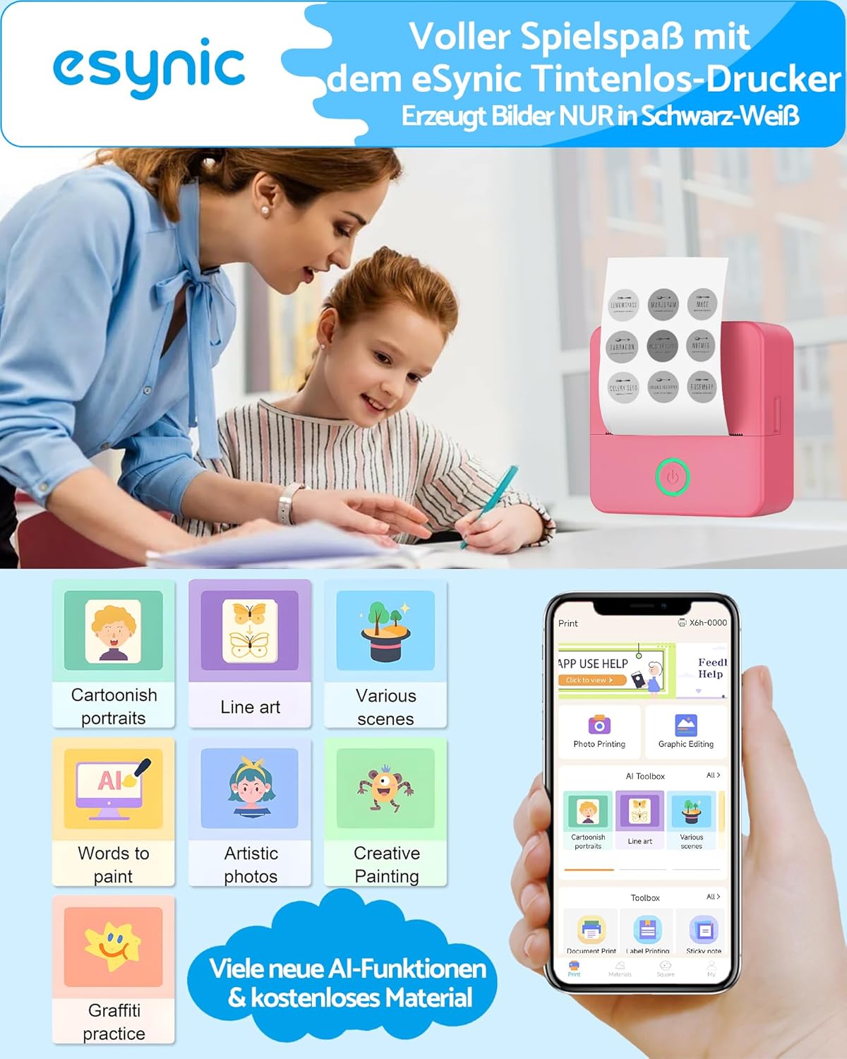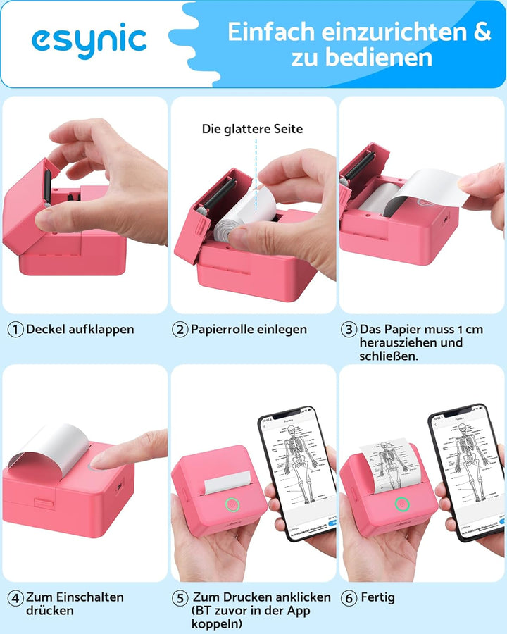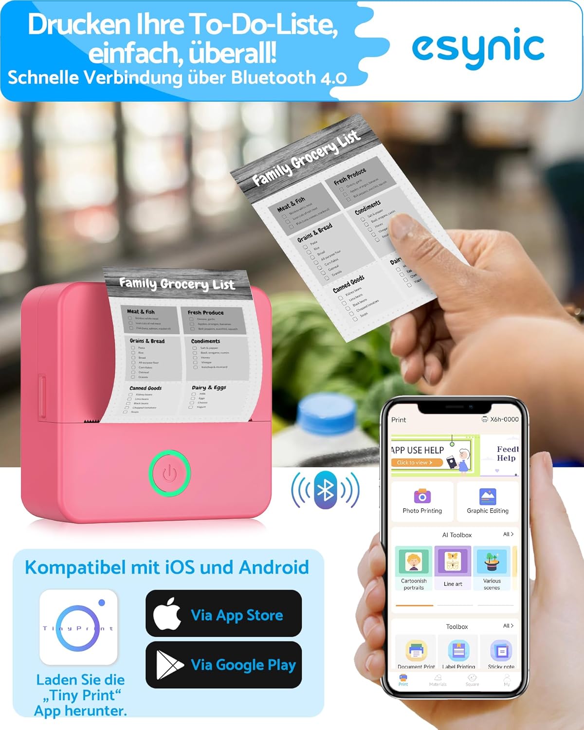 - Effizient und Tragbar – Mini Drucker im kompakten Design (85×85×45mm), ideal für den mobilen Einsatz. Perfekt zum Drucken von Notizen, Etiketten, Handbüchern, Webseiten und mehr.