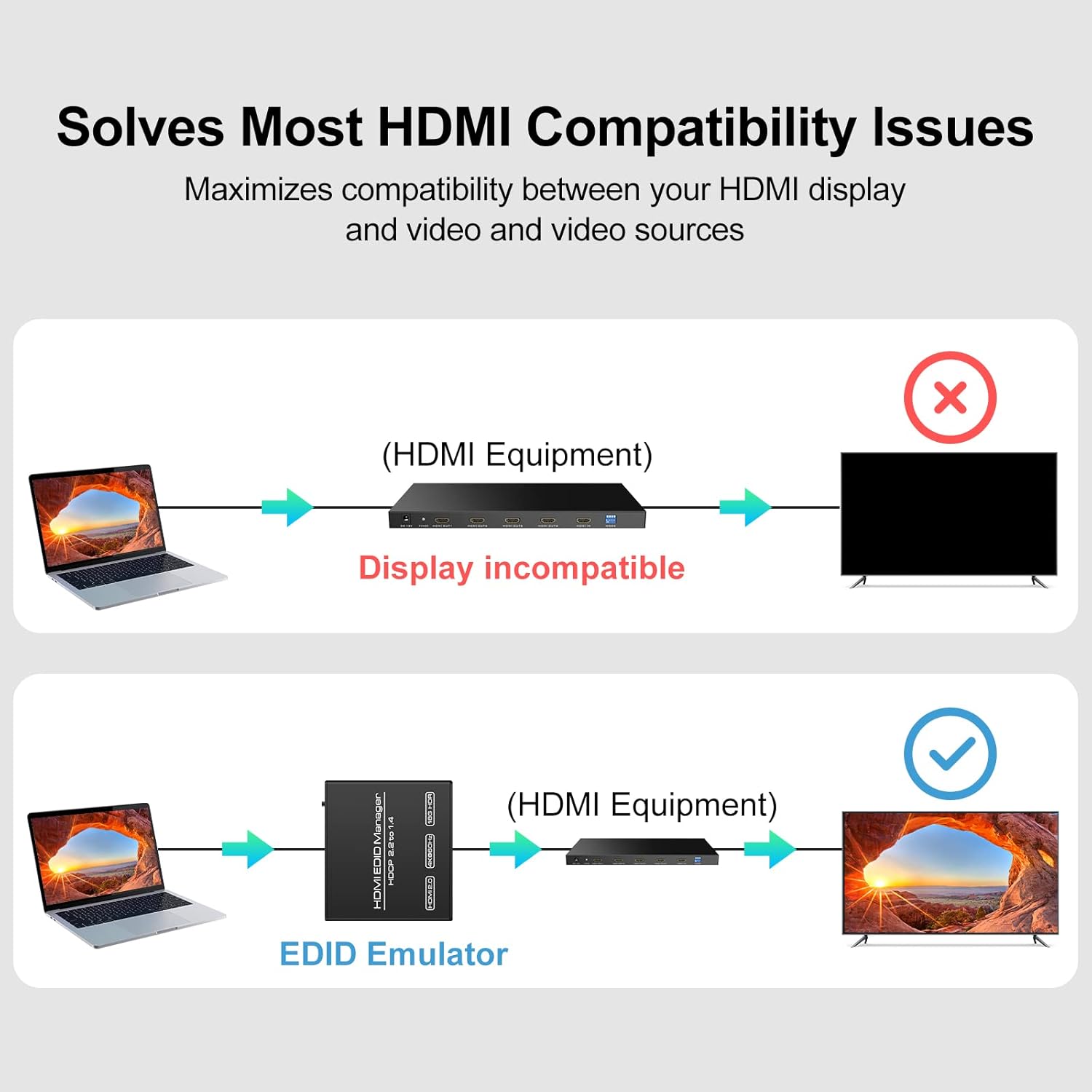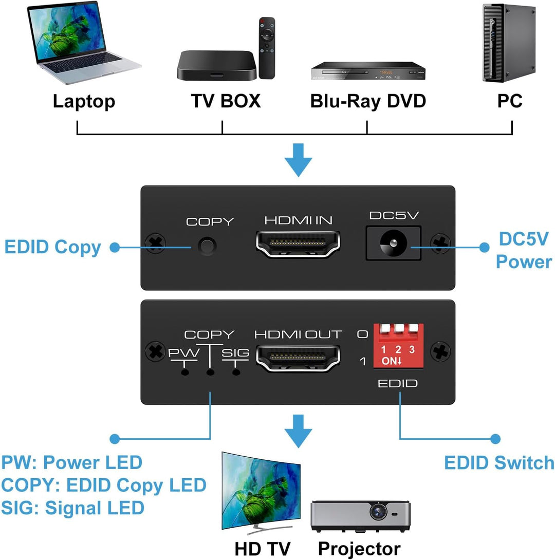 - Dieser EDID HDMI-Manager ist ein Produkt, das das Problem der EDID-Inkompatibilität zwischen mehreren HDMI-Geräten löst und die Funktion zum Kopieren und Speichern der EDID-Daten der endgültigen Anzeigevorrichtung und 8 voreingestellten Edid-Daten